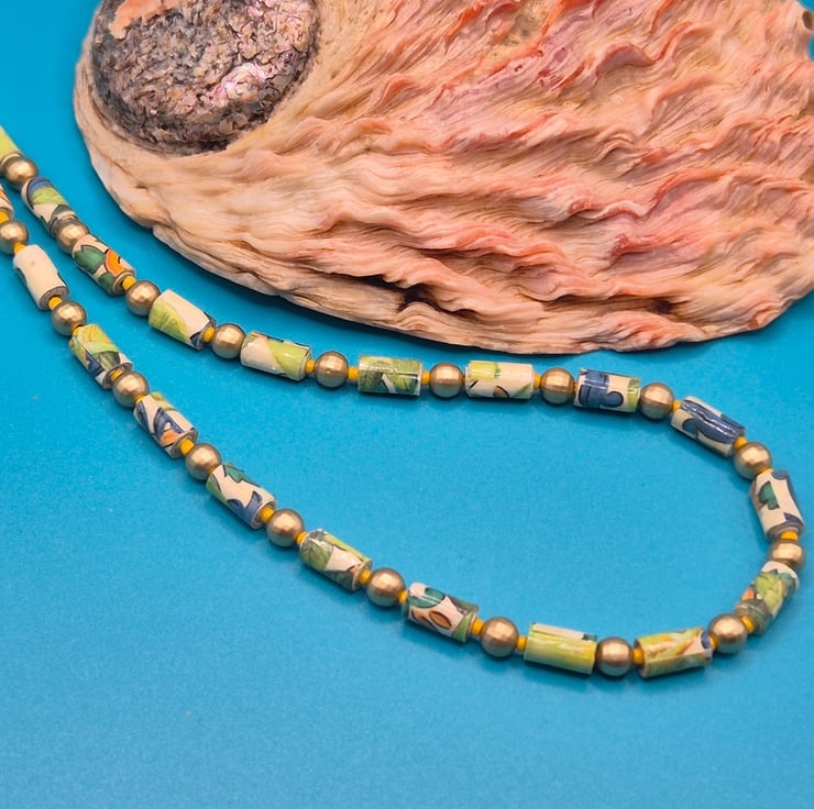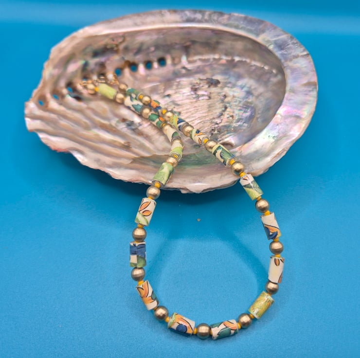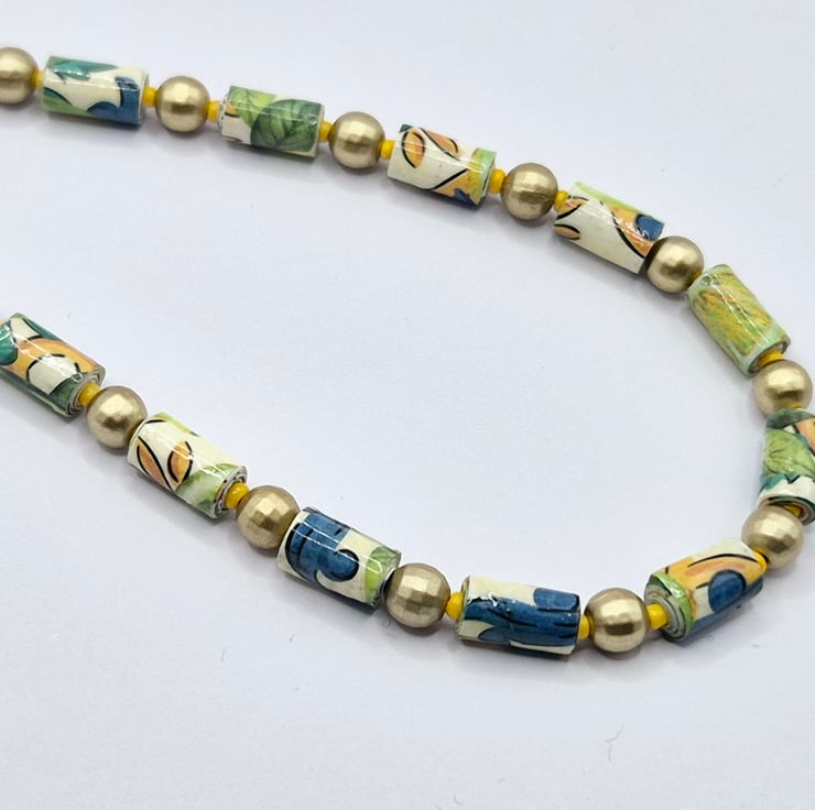 A delicate and pretty collar necklace made with paper beads. The handrolled beads were made from a soap wraper with a leaves and flowers motif. The beads are complemented with multifaceted golden beads.