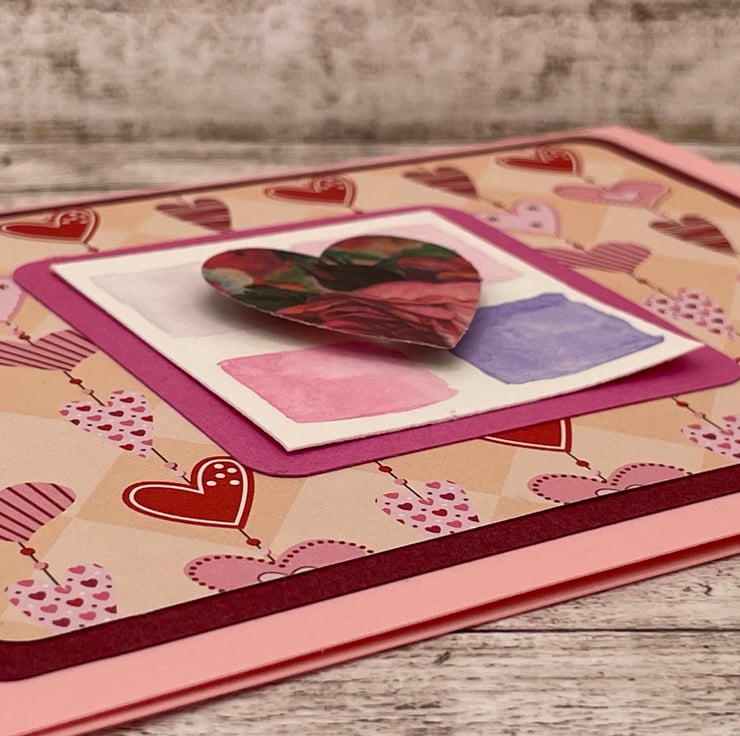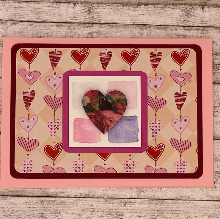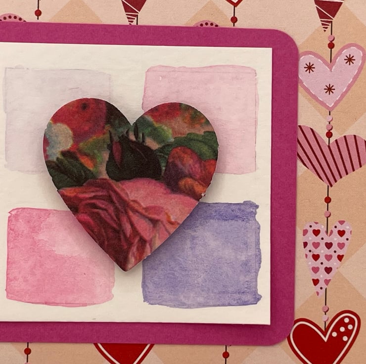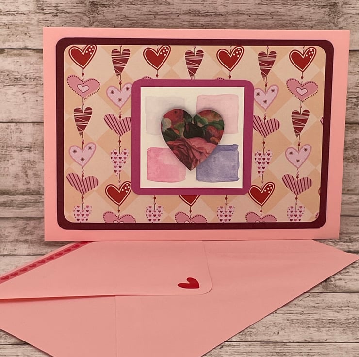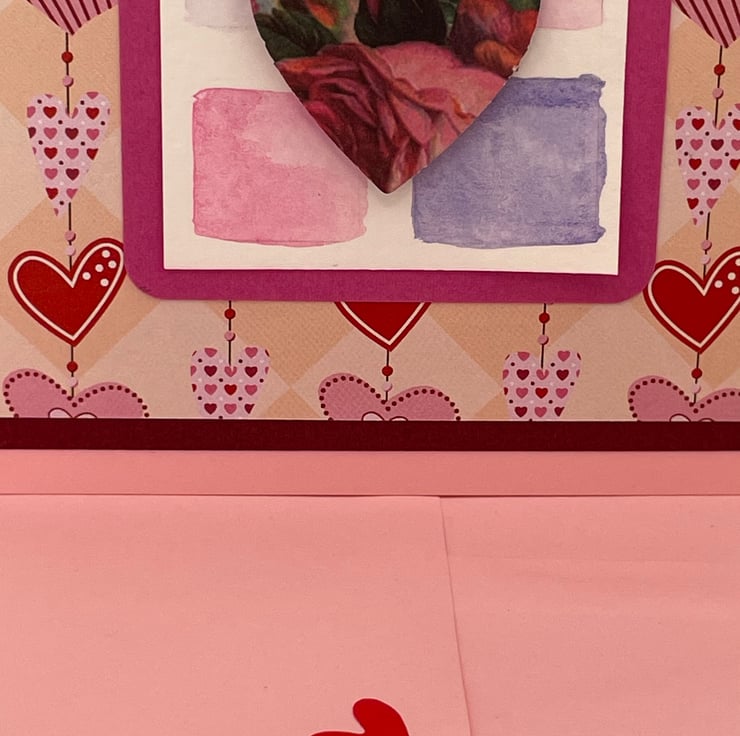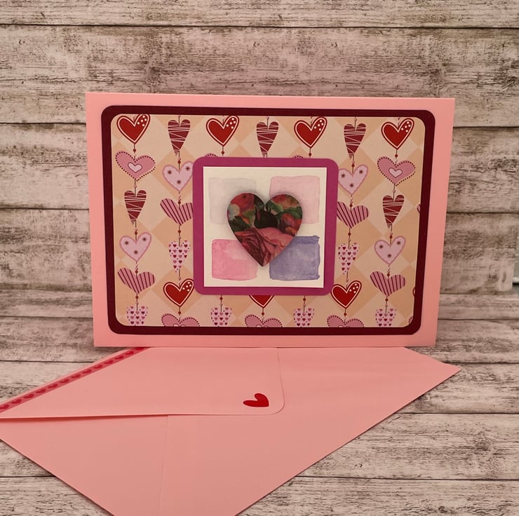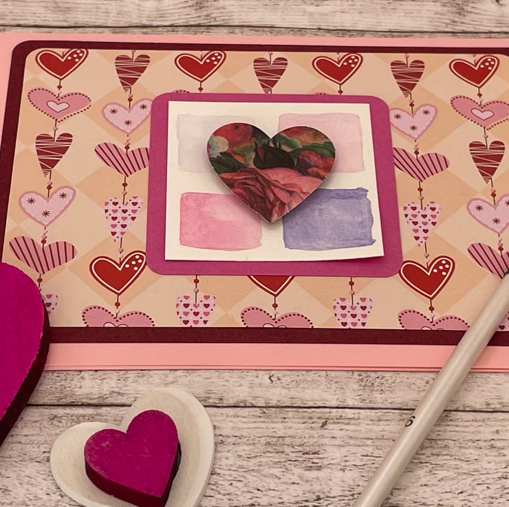 This card began by exploring various pink and lilac shades of watercolours to create the grid of four pastel shades. From this I decided that a cut out heart with rose illustration would be the central focus and fixed this on with a foam pad to add some depth. From there I looked at finding a patterned paper in keep with the theme, and chose one with cute bright hearts printed to form the background behind the mounted heart grid. To complete the card and make the hearts a feature, I chose a deep red backing card to frame the design. The inside of the card I left blank to write your own message. I also decorated the back of the envelope with a narrow washi tape in a heart design and a small heart sticker that ties in nicely with the theme. The card measures 15cm by 10cm and the envelope is pink to match. A unique card that could be sent for Valentines Day, Wedding, Engagement, Birthday, there are so many possibilities! All cards are sent in a 100% recycled hardboard back envelope to ensure safe transport. A perfect card to congratulate someone on their engagement or wedding with the handmade special touch. Postage on additional items from my shop is free so checkout some of my other creations .