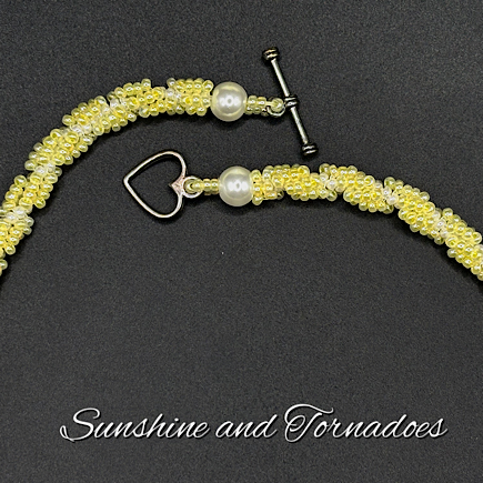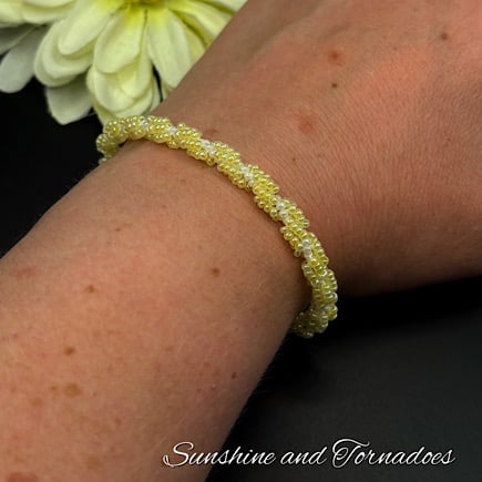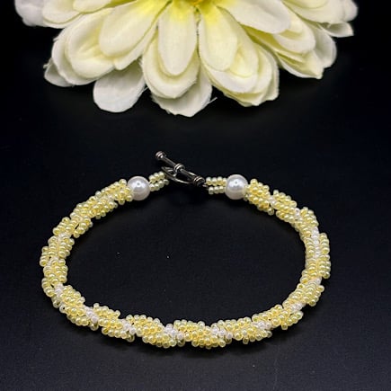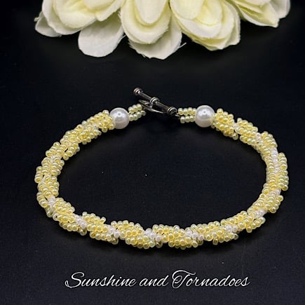 This stunning spiral rope bracelet has been made using beautiful pale yellow and white Toho glass seed beads (15/0) and fireline beading thread. It is finished with 6mm faux pearl beads and a silver plated, heart shaped toggle clasp.