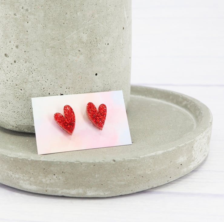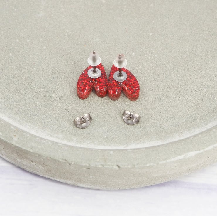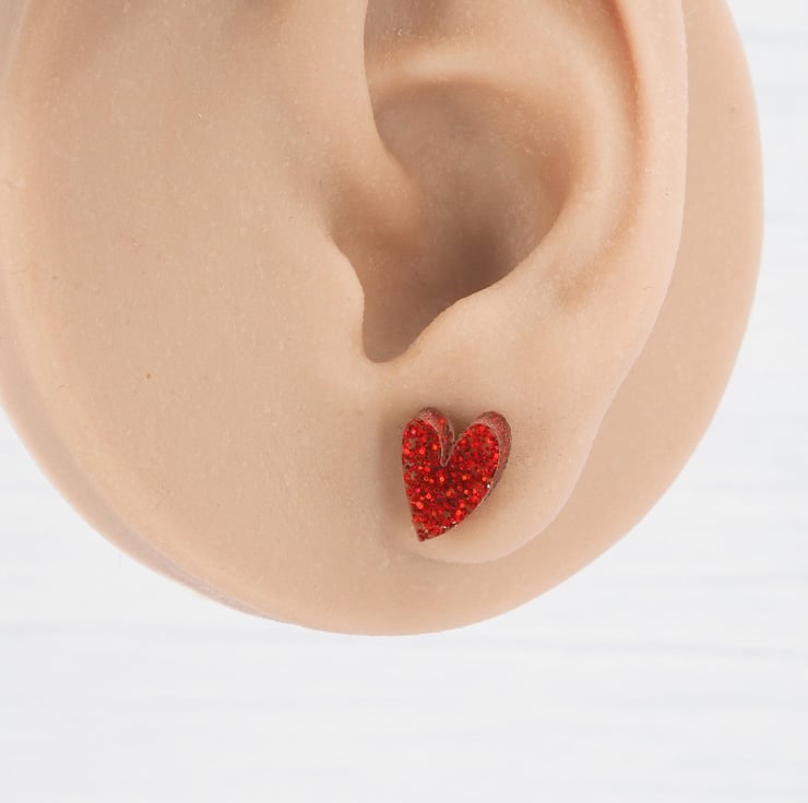 Red glitter heart acrylic studs with 0.7mm ear stems.