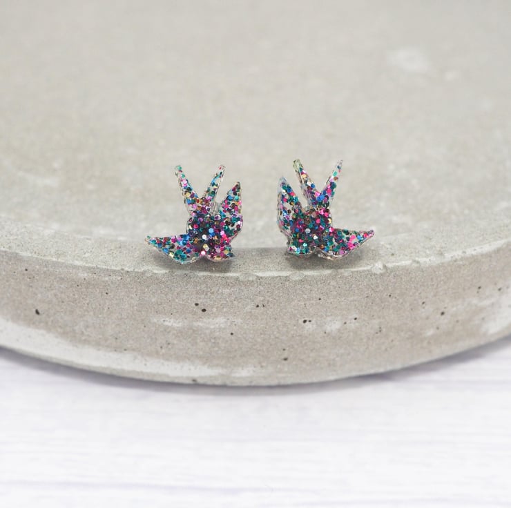 Mixed glitter acrylic swallow bird studs with 0.7mm ear stems.