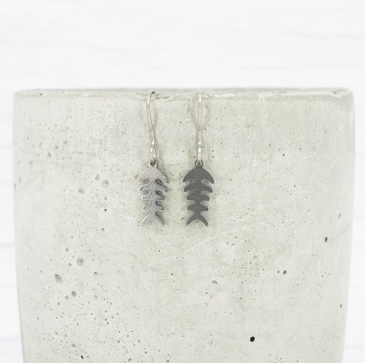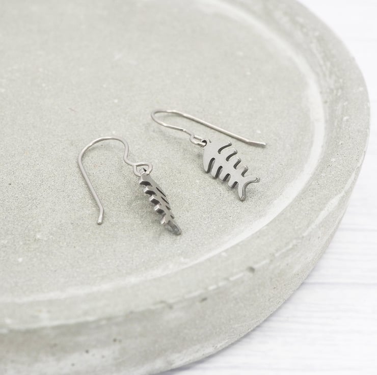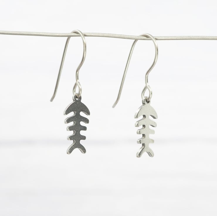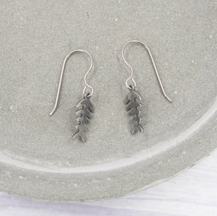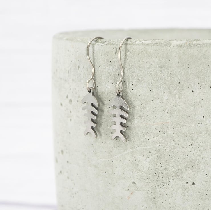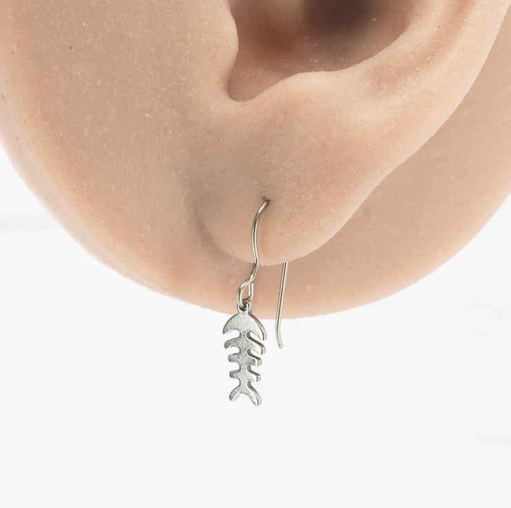 Stainless steel Fishbone skeleton dangle earrings with Grade 1 0.7mm titanium ear wires.