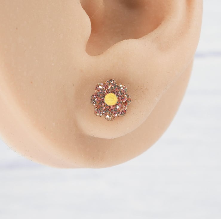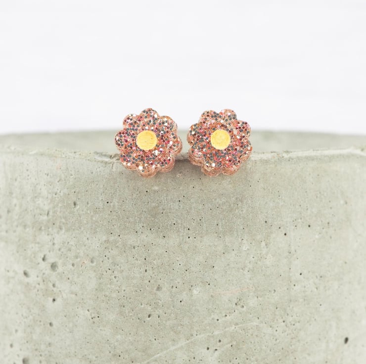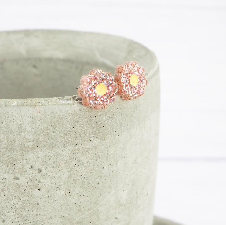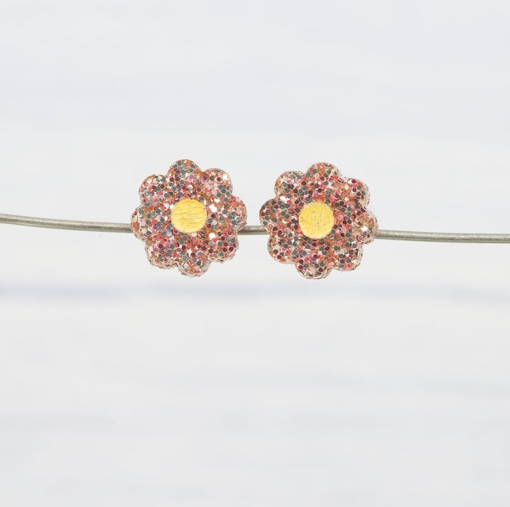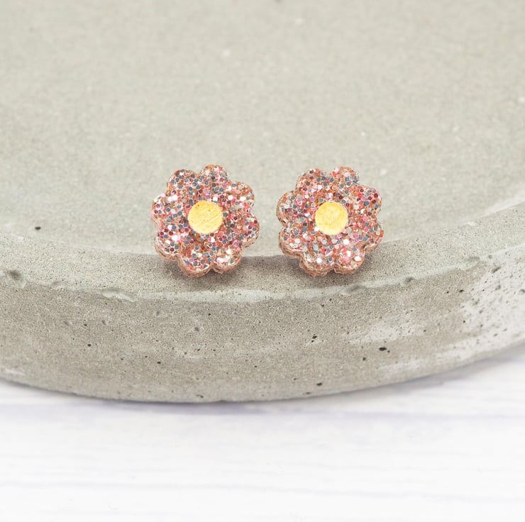Rose pink glitter small flower blossom acrylic studs with 0.7mm ear stems.