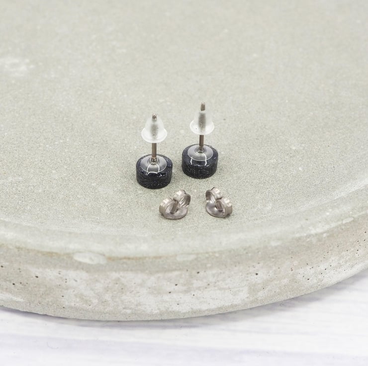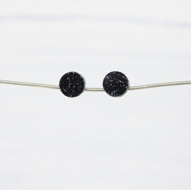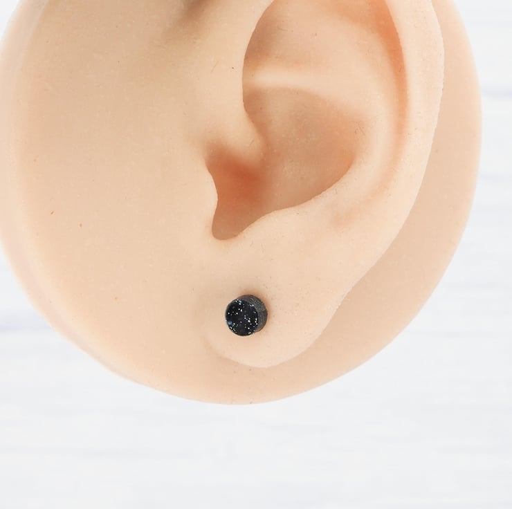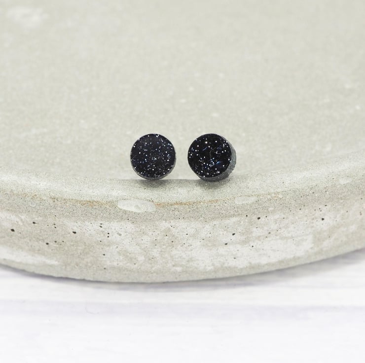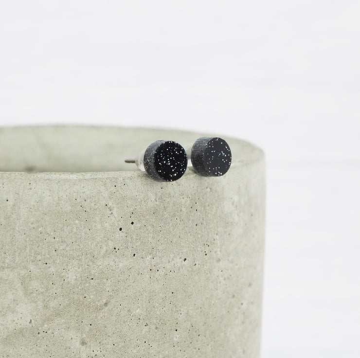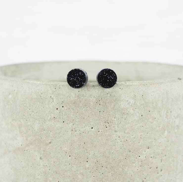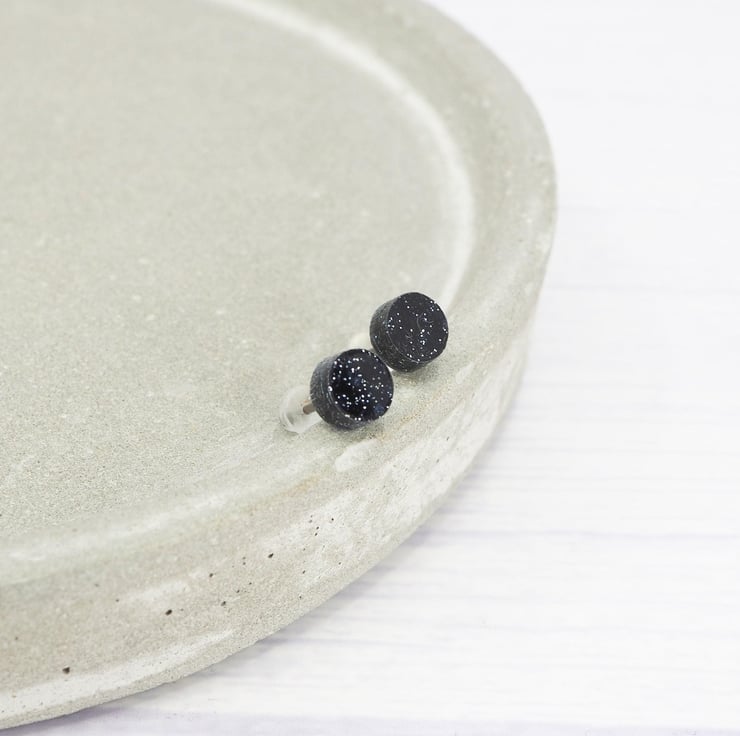 Black glitter acrylic dot studs with 0.7mm ear stems.