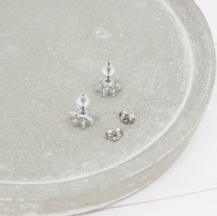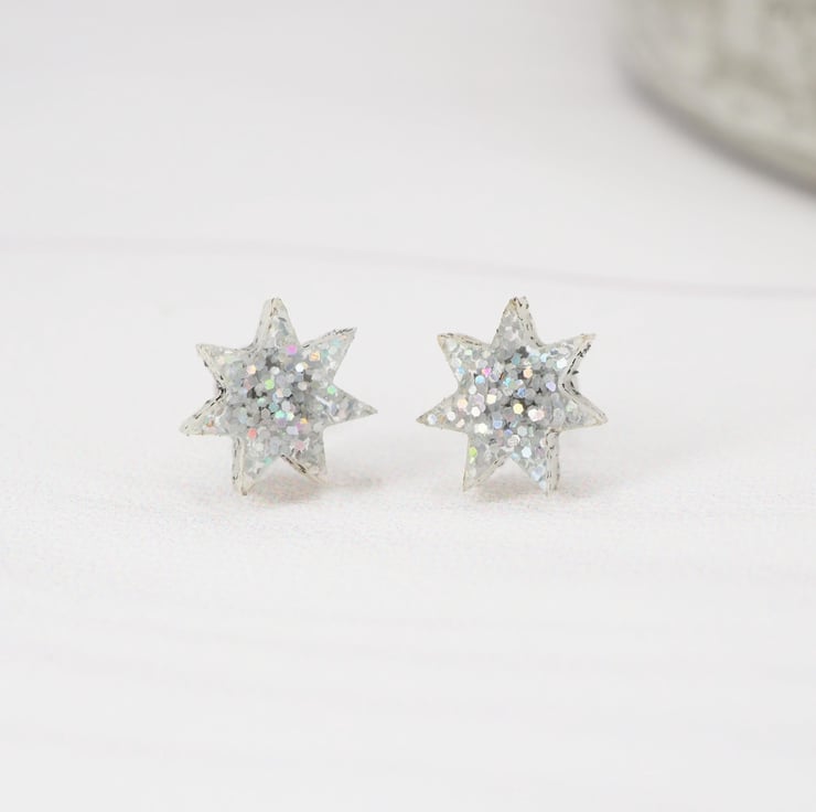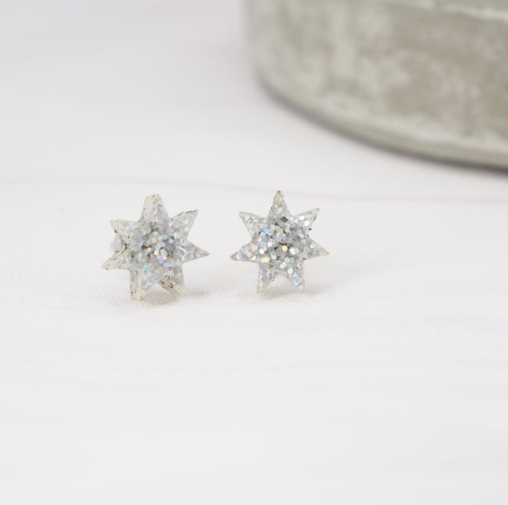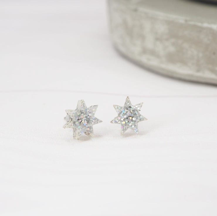Holographic glitter star acrylic studs with 0.7mm ear stems.
