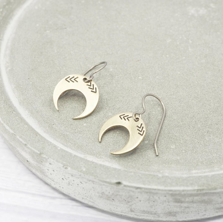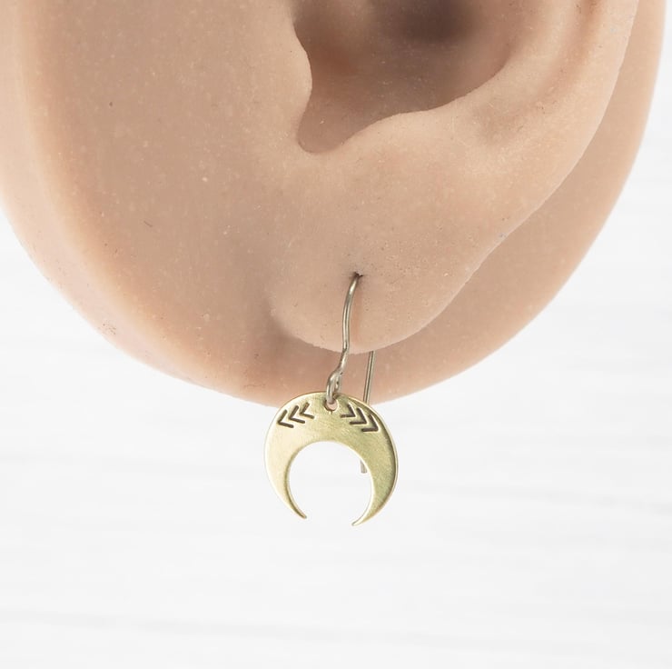 Hypoallergenic titanium ear wires - Brass small crescent stamped dangle earrings