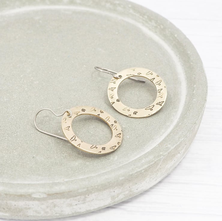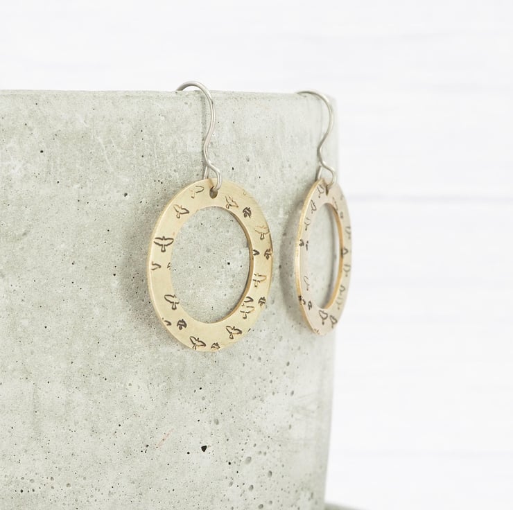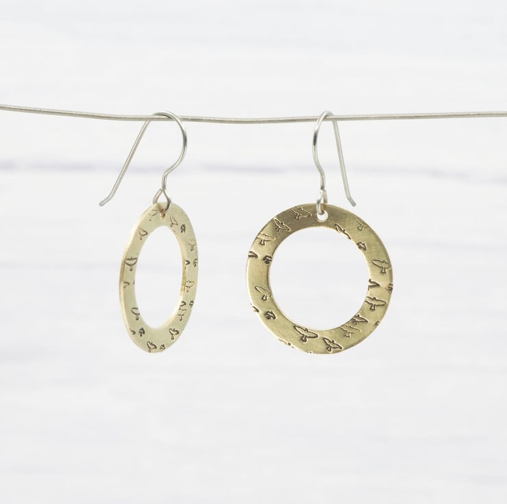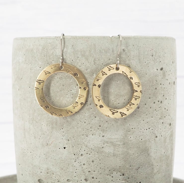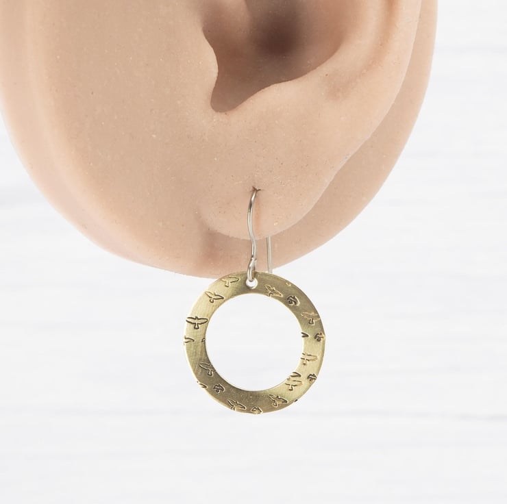 Small Brass bird stamped hoop dangle earrings - Titanium ear wires
