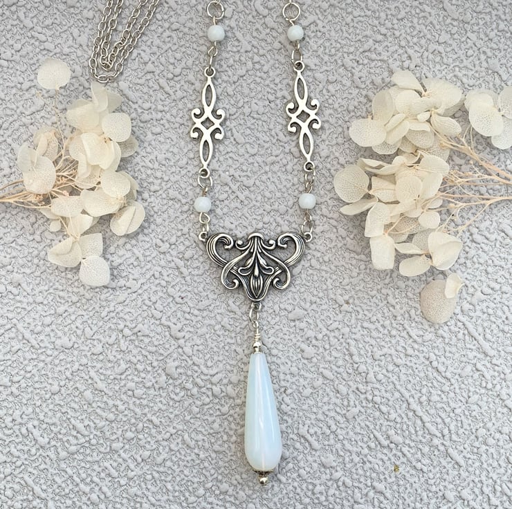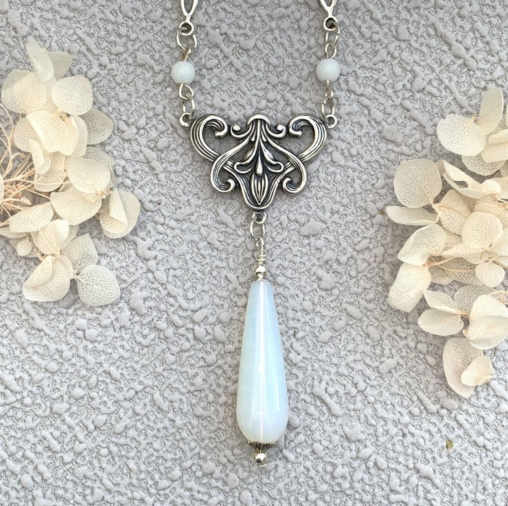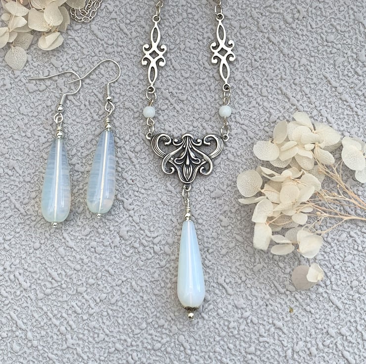 This pretty necklace and earrings set is made in a vintage Edwardian style which features a lovely floral design silver-plated motif which has a pretty moonstone teardrop feature bead. The necklace includes tiny glass beads and silver tone connectors. The necklace is finished with a silver plated chain and has a pair of matching moonstone earrings.