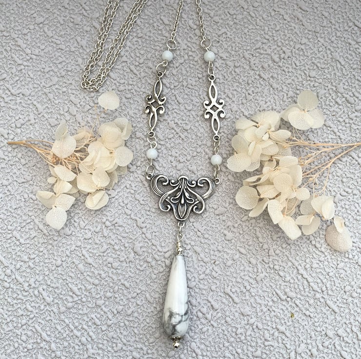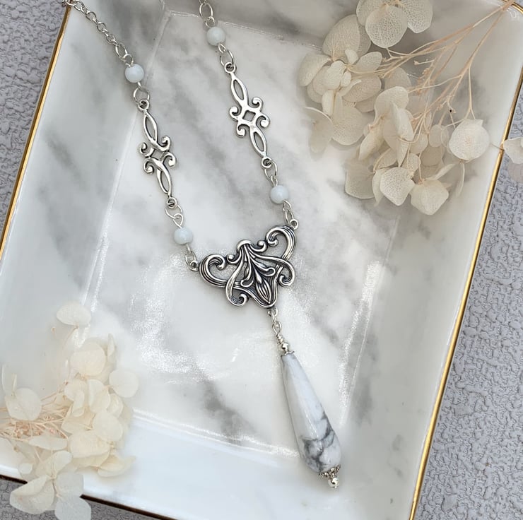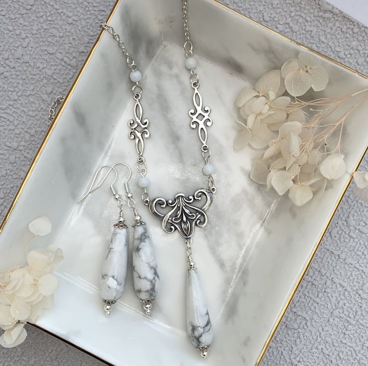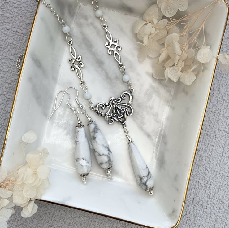 This pretty necklace and earrings set is made in a vintage Edwardian style which features a lovely floral design silver-plated motif which has a howlite teardrop feature bead. The necklace includes tiny glass beads and silver tone connectors. The necklace is finished with a silver plated chain and has a pair of matching howlite earrings.