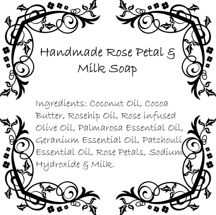 Ingredients: Coconut Oil, Cocoa Butter, Rosehip Oil, Rose infused Olive Oil, Palmarosa Essential Oil, Geranium Essential Oil, Patchouli Essential Oil, Rose Petals, Sodium Hydroxide & Milk.