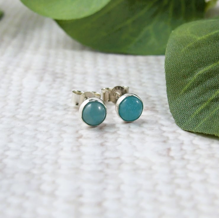 The dainty 6mm studs have been created from pretty mint green 6mm amazonite gemstones set in sterling silver bezel. Studs have butterfly backs.
