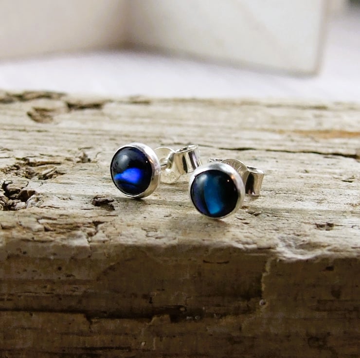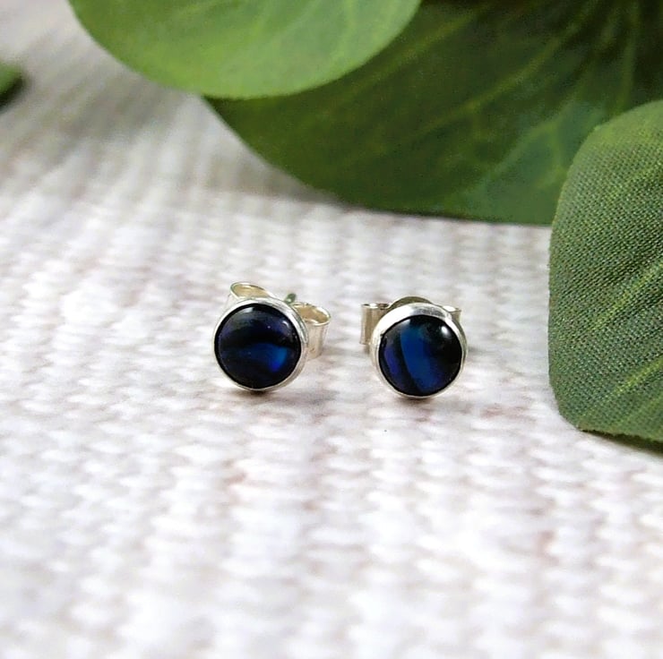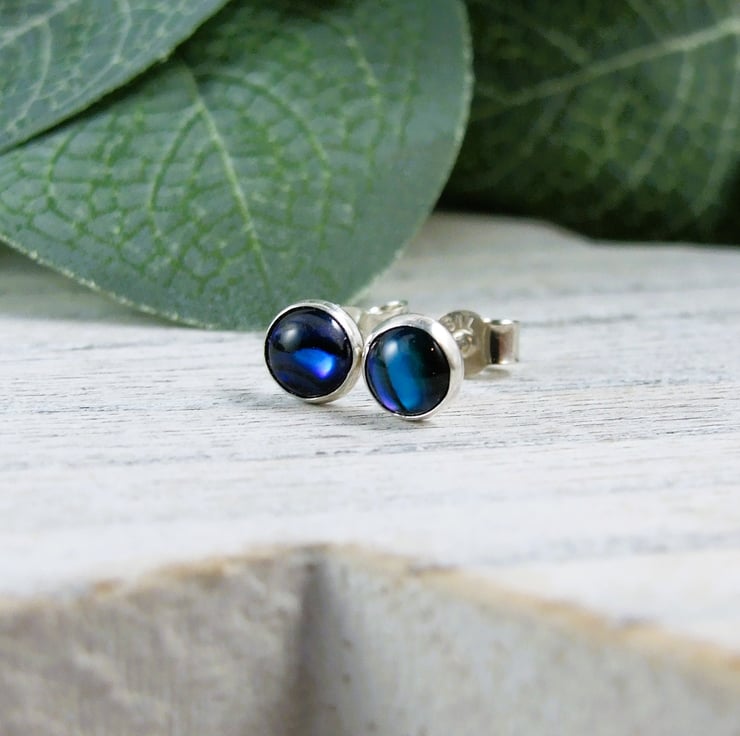 The dainty 6mm studs have been created from pretty blue green 6mm paua shell cabachons set in sterling silver bezel. Studs have butterfly backs.