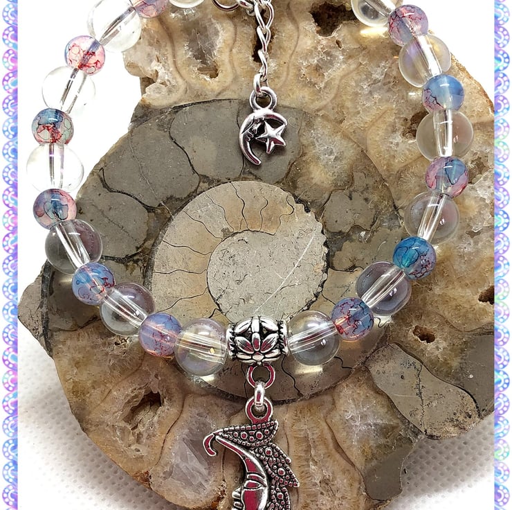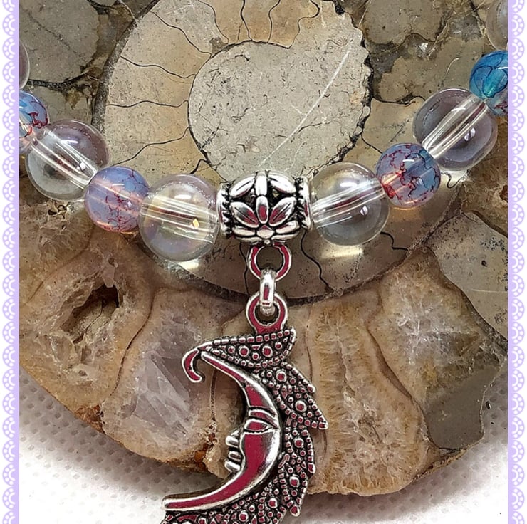 Created using this Tibetan silver crescent moon charm &connector, I’ve threaded clear lustre beads & marbled beads onto stainless steel memory wire with lobster clasp & extension chain. Adult wrist size. Nickel free.