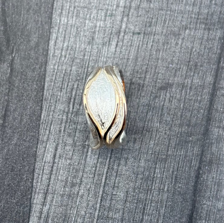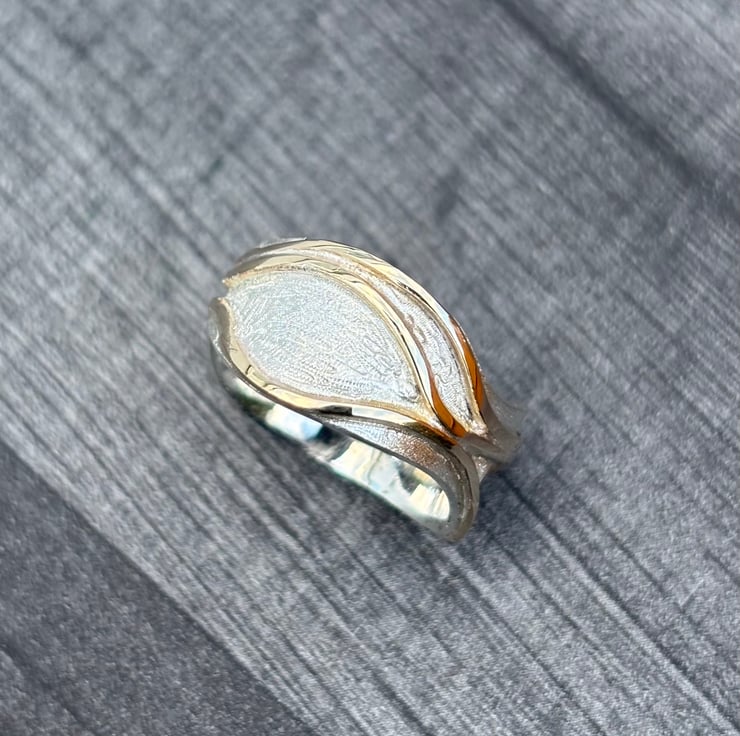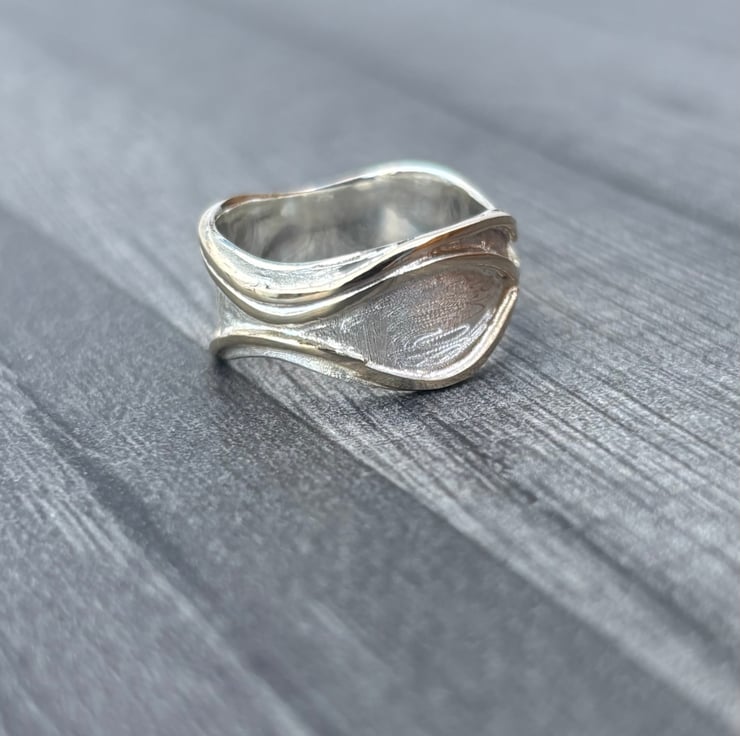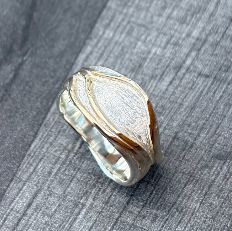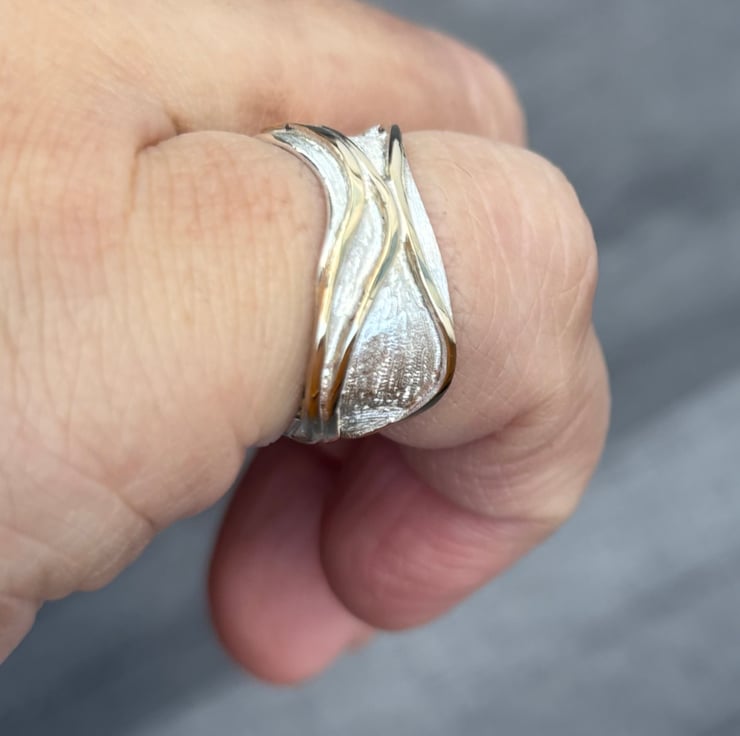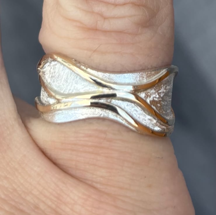 This Gold Waves Ring has been handcrafted using solid Sterling Silver and solid 9ct yellow gold waves that are fixed all the way around. The gold is shiny which contrasts beautifully with the satin finish silver underneath. The band measures approximately: 8mm in width at its widest point. The ring has a wavy edge. Michelle can make this ring in any size so make sure you leave a message at Checkout.