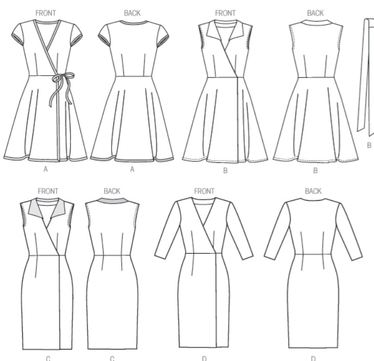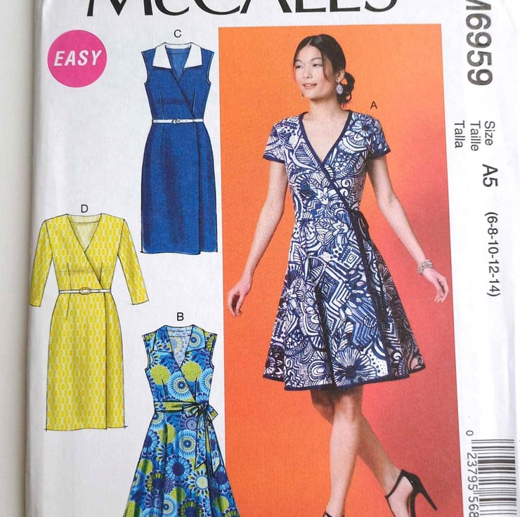 Sewing pattern for a wrap dress from McCall (7812), with a fitted bodice, inside ties and skirt variations. Suitable for medium weight woven fabrics.