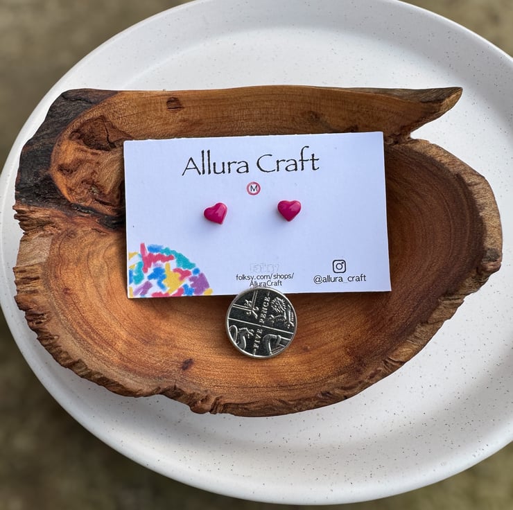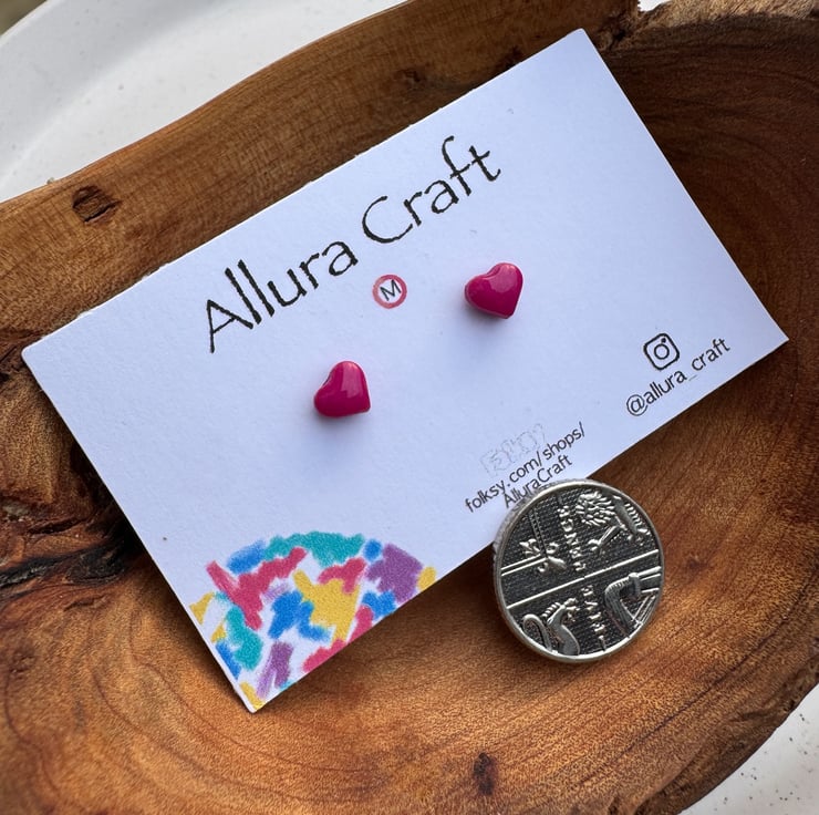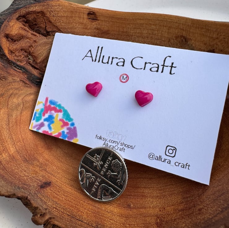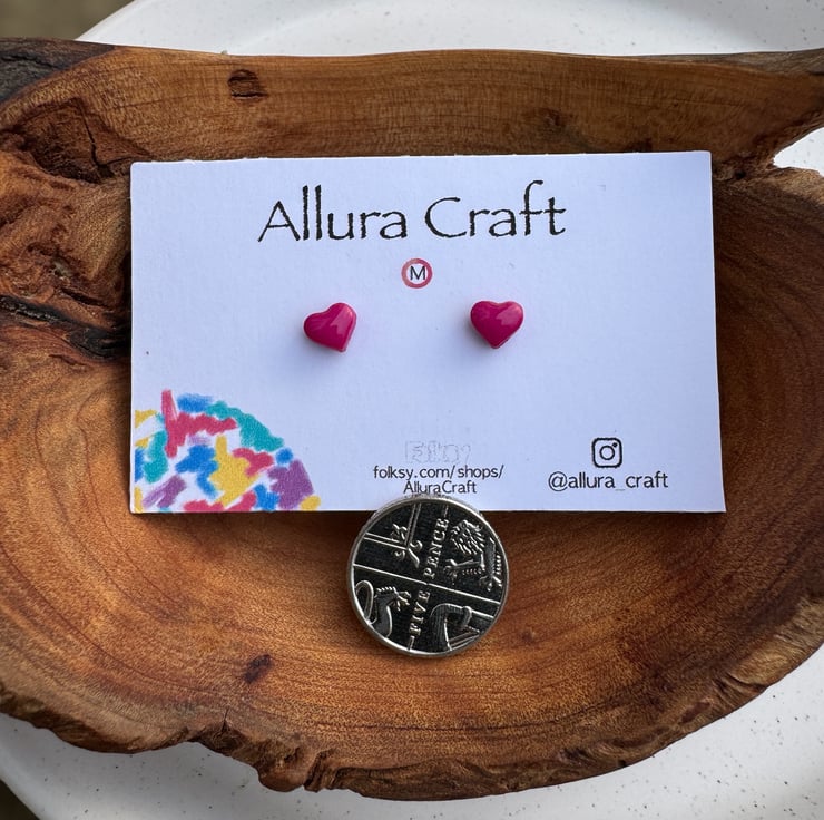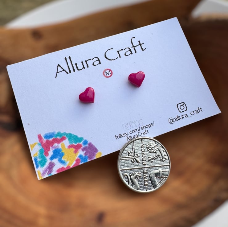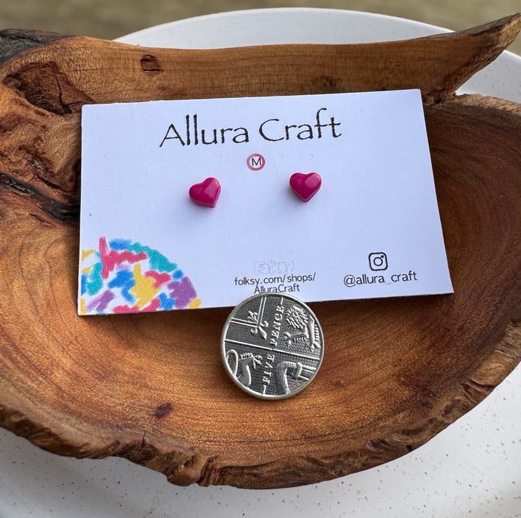 Dainty micro Fuchsia Pink heart studs with a glossy uv resin finish