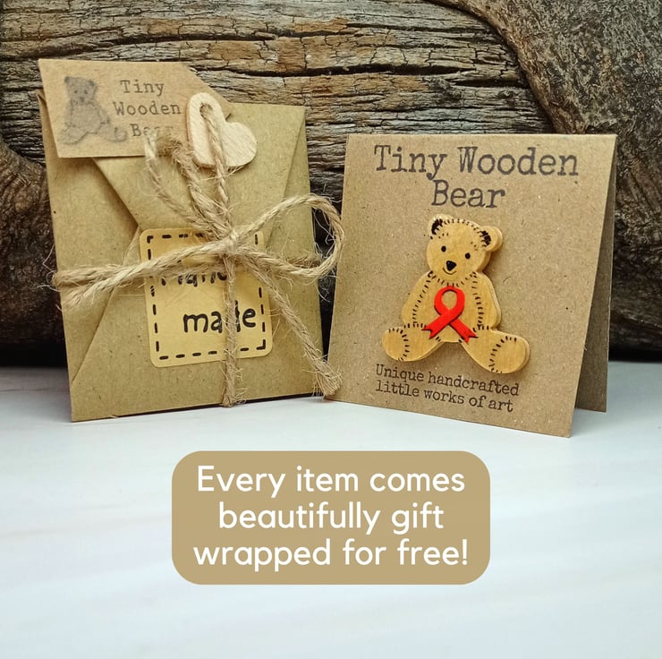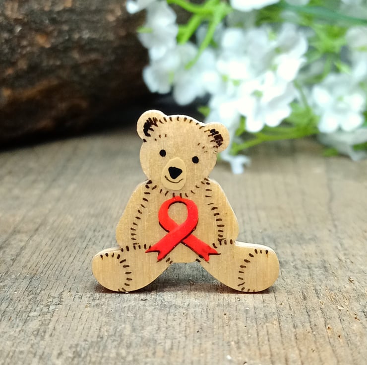 This handmade wooden teddy bear pin is a heartfelt way to show support for heart disease awareness. Featuring a red ribbon, it serves as a meaningful symbol of encouragement, care, and remembrance. Whether you want to thank a nurse, gift it to someone affected by heart disease, or simply spread awareness, this charming bear is the perfect choice.