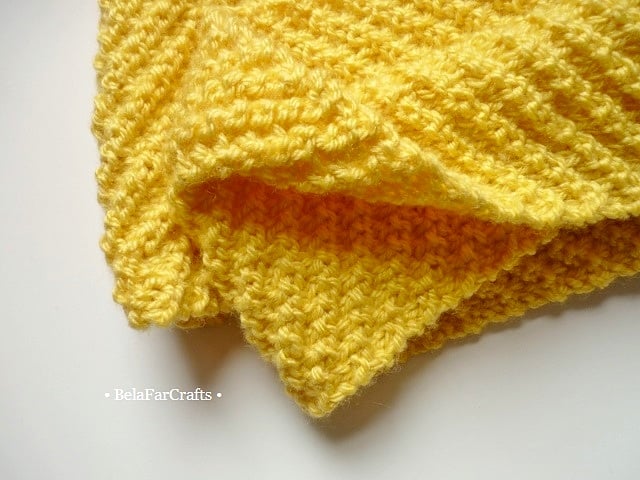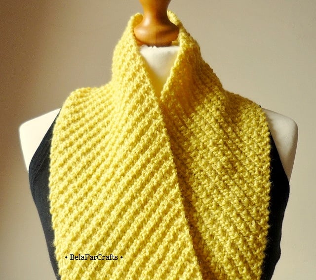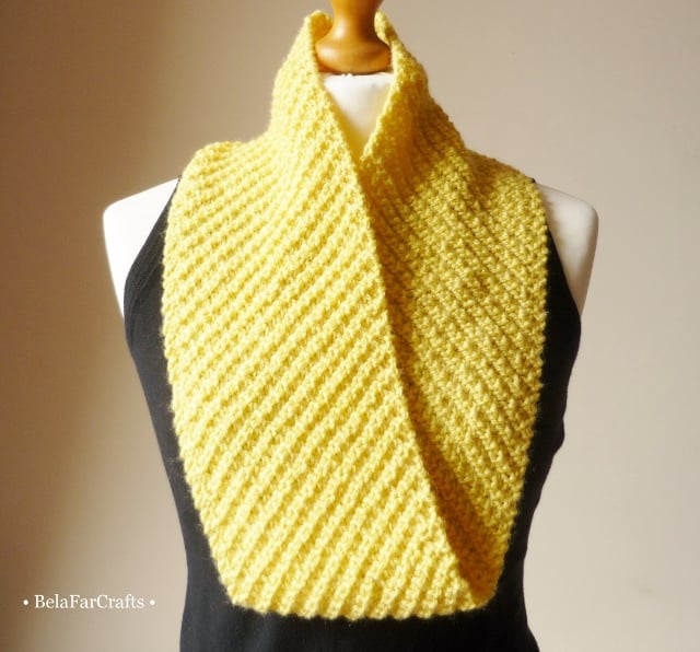 I used a very soft wool blend yarn in stirking yellow colour. As it is now discontinued, this cowl is one of a kind in my shop.