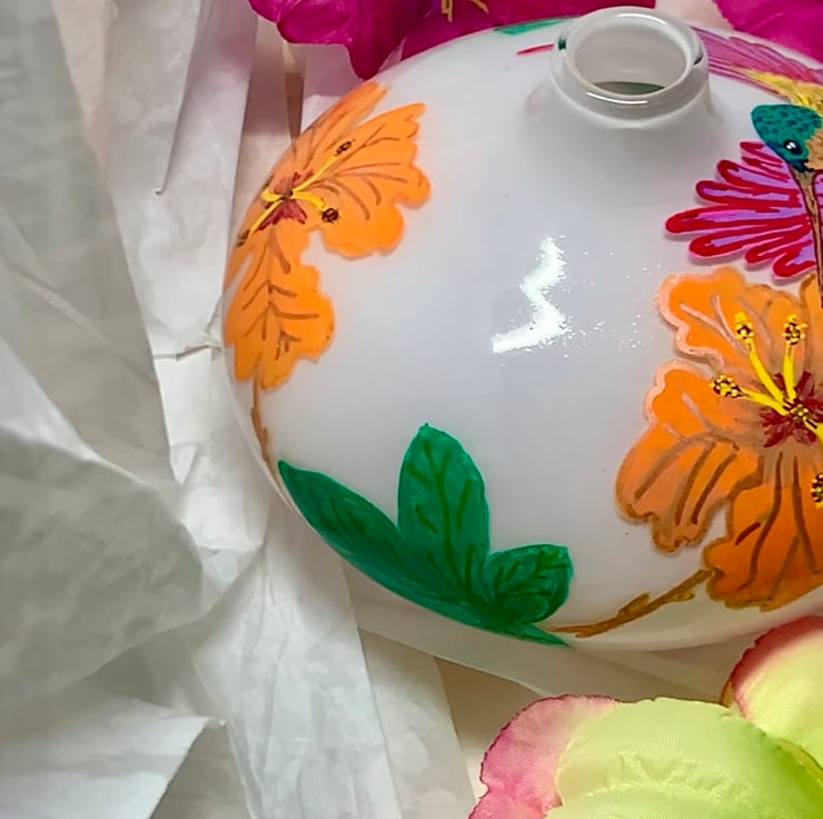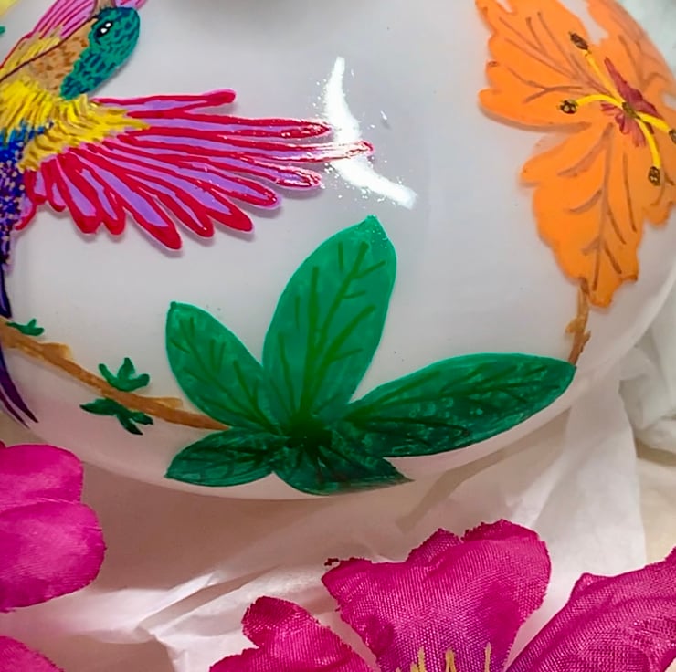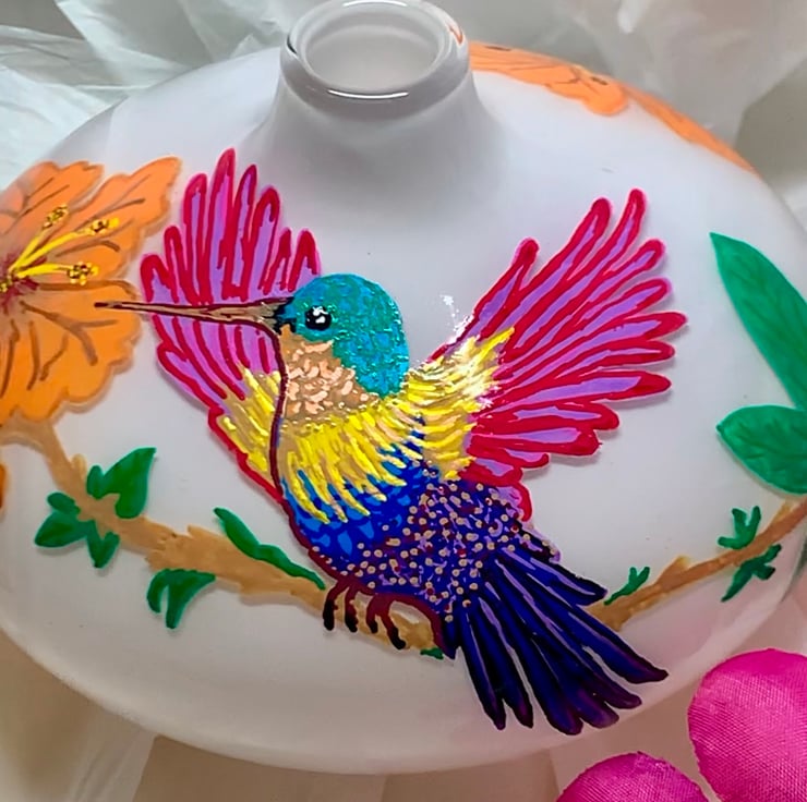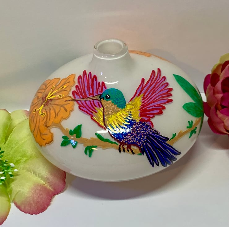 This One of a kind Hand painted white glass vase is decorated with a striking Hummingbird amongst delicate flowers. The vibrant colours which I've used for the bird blend beautifully with the subtle tones of the surrounding flowers and leaves. Can you spot the gorgeous iridescence throughout the design especially on the hummingbird.