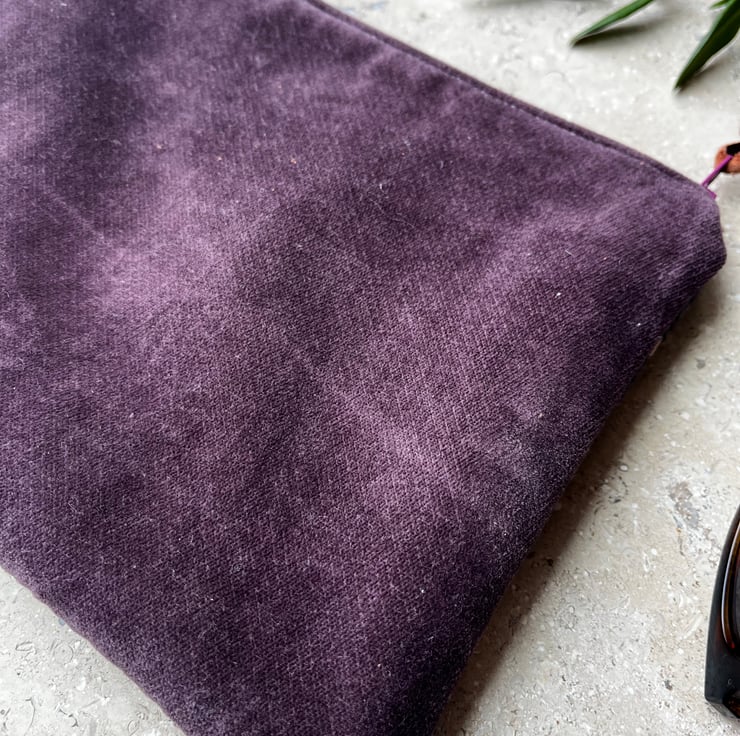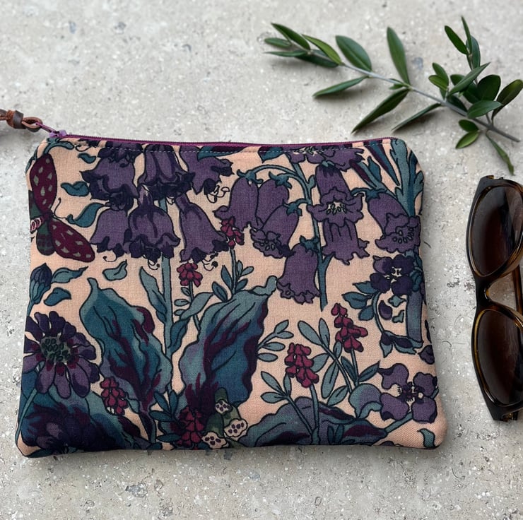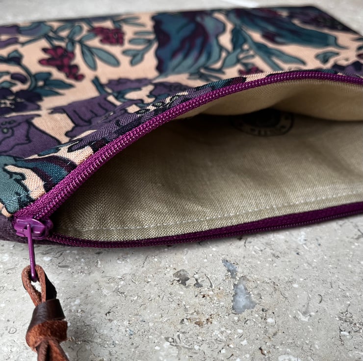 Vintage Liberty Penelope zip pouch. This little bag has been made from lightweight wool fabric from a handmade skirt and backed with velvety moleskin from a pair of trousers in a lovely deep plum colour. The pouch is fully lined with taupe linen and has a layer of soft padding.