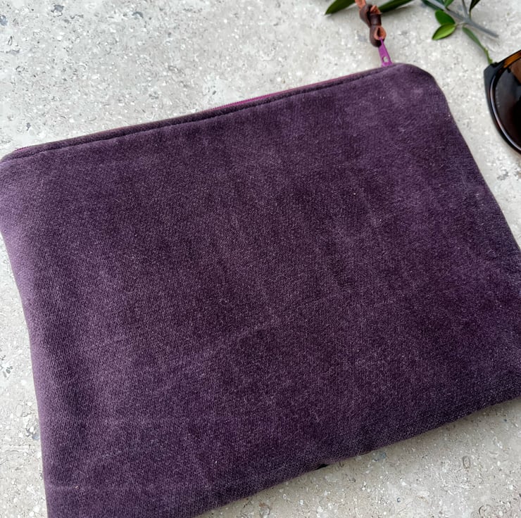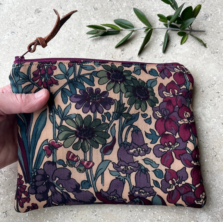 Vintage Liberty Penelope zip pouch. This little bag has been made from lightweight wool fabric from a handmade skirt and backed with velvety moleskin from a pair of trousers in a lovely deep plum colour. The pouch is fully lined with taupe linen and has a layer of soft padding.