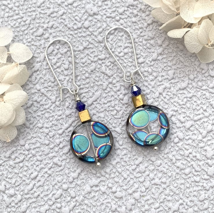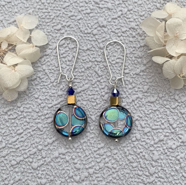 These boho earrings are made with Czech glass disk beads that have iridescent spot patterns which change in the light when moved. The earrings are finished with small hematite cube beads and tiny silver-plated beads. They are finished with silver-plated kidney wires and they are 5cm in total length.