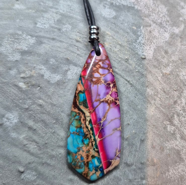 Colourful and unique Rainbow sea sediment pendant on black leather cord with stainless steel connector and slider.
