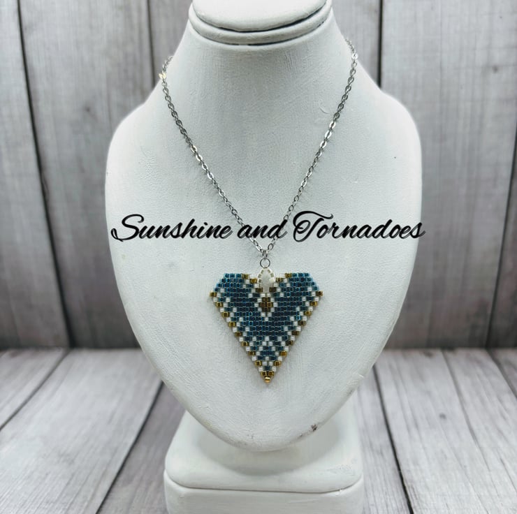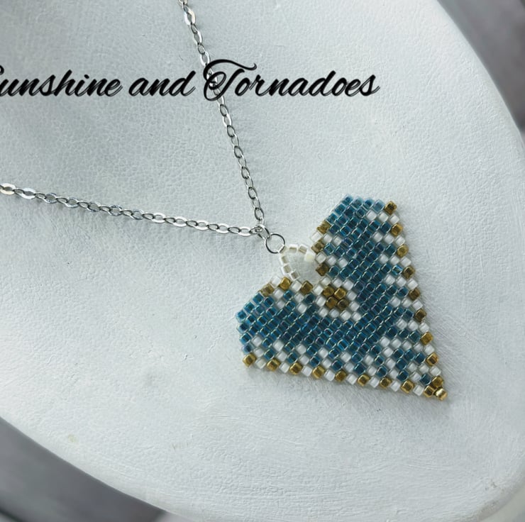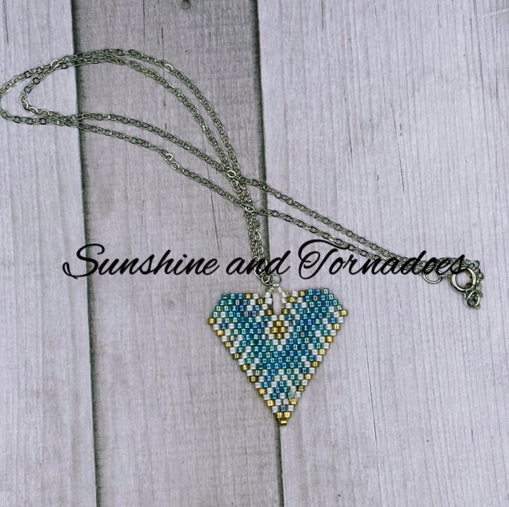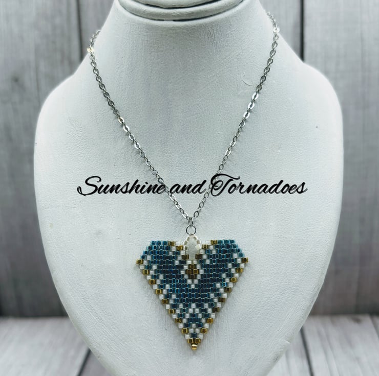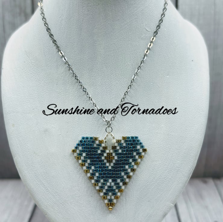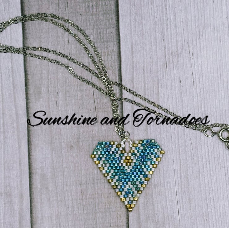 This stunning Heart Shaped Pendant has been handmade using Miyuki Delica Beads and Fireline Beading Thread. The Gold Beads in this design are Gold Plated.