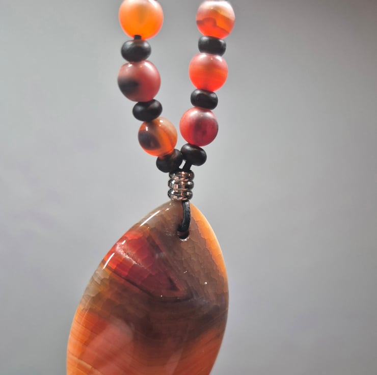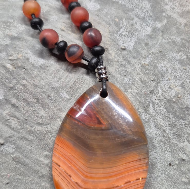 Red Stripes Onyx Agate pendant on Black leather cord with matching sun stone beads and black howlite spacers, with stainless steel connector and slider.