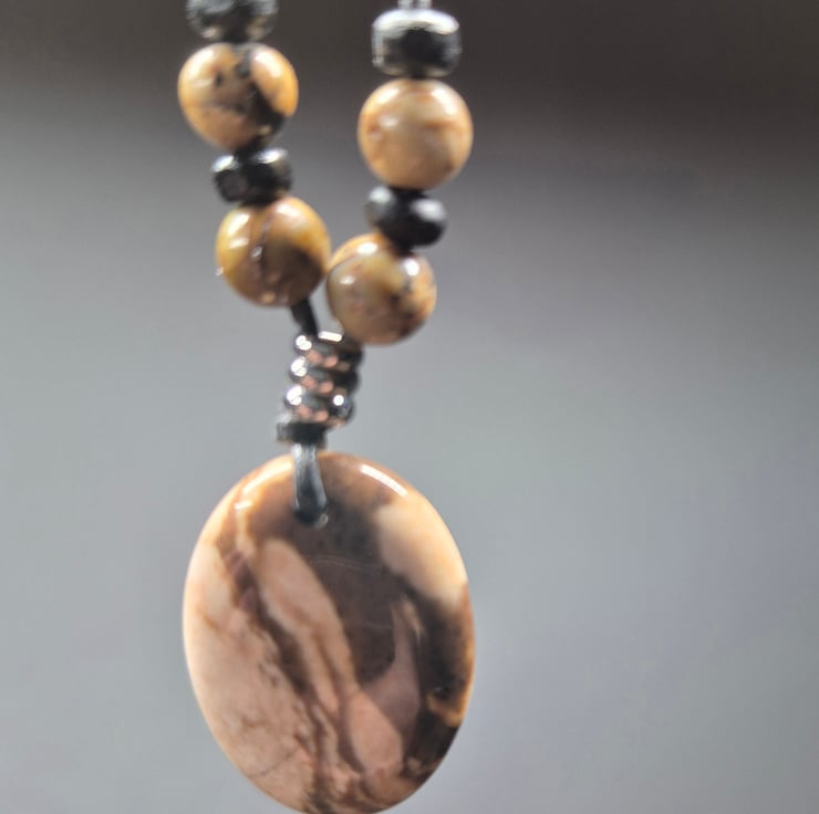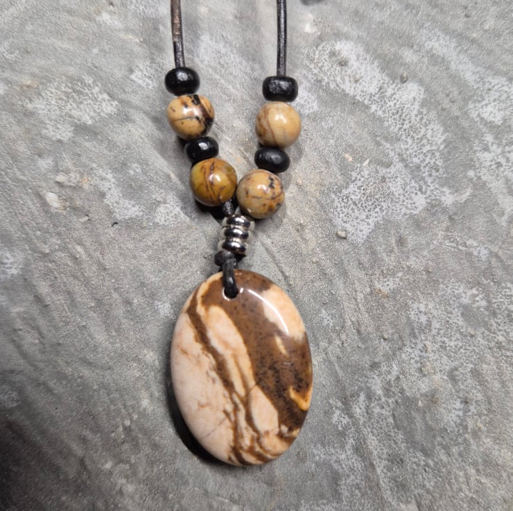 Picture Jasper oval pendant on gypsy sippa leather cord with matching 6mm jasper beads and black howlite spacers finished with stainless steel connector and slider.