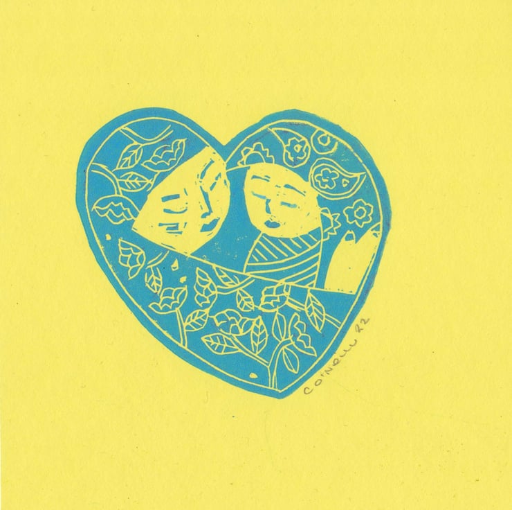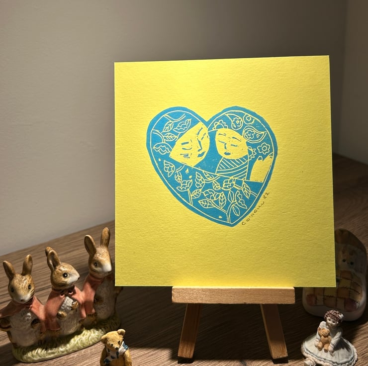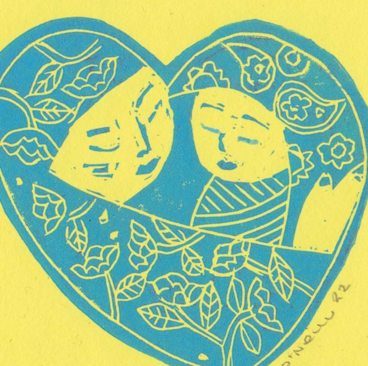Original Lino print of a mother and child snuggled in a shawl. This is a one off in this colourway. I have also produced it in a red heart on white and blue and white. Would make a lovely gift for a new mum or for mothers day or valentines gift.