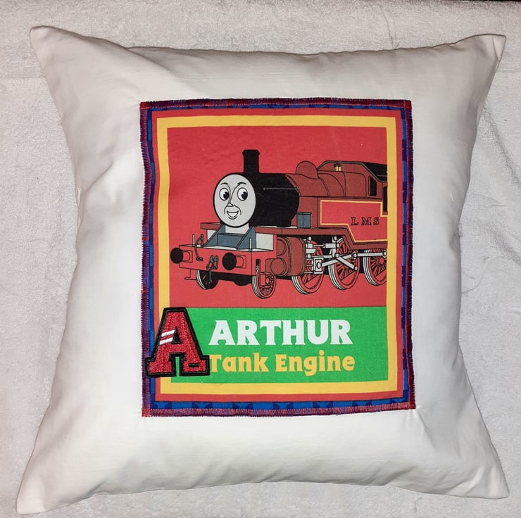 Arthur the red Tank Engine cushion, appliqued onto a cream background.