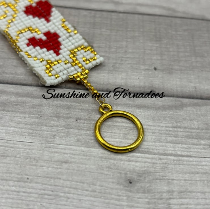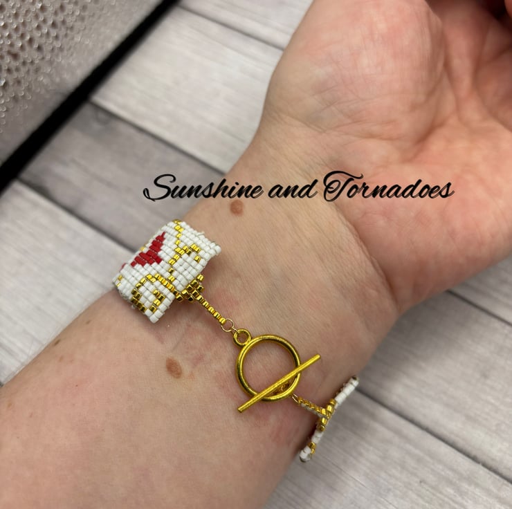 The bracelet is made using a beading loom, row by row, and finished using Gold Plated Delica beads and a gold plated toggle clasp.