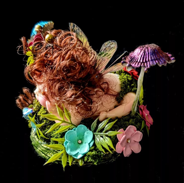 Aine has been lovingly created by me from Polymer clay and a Mould and the scene has been put together with different mediums flowers and string lights