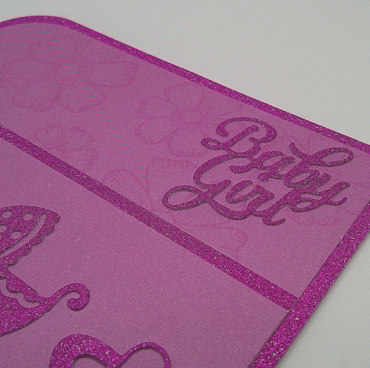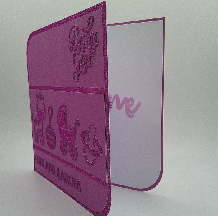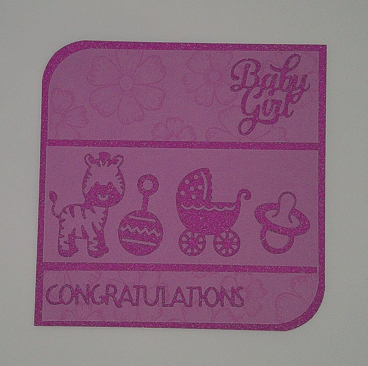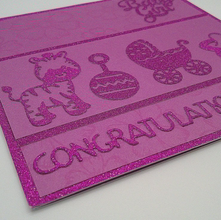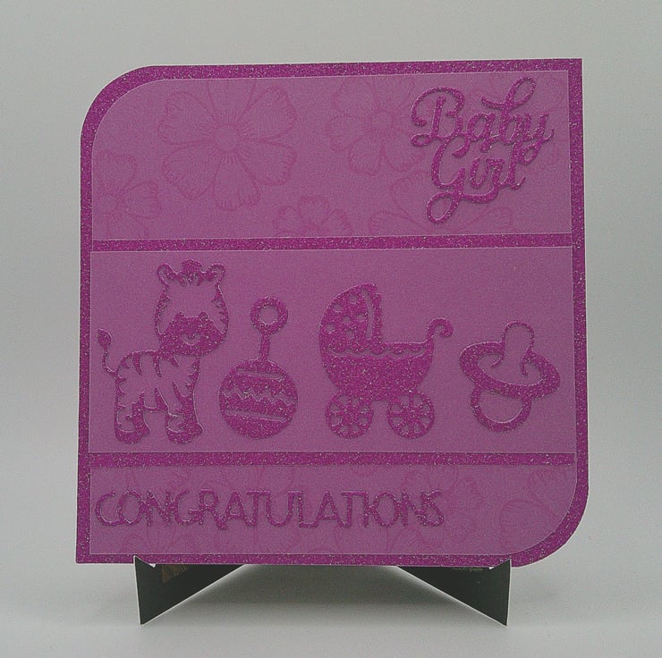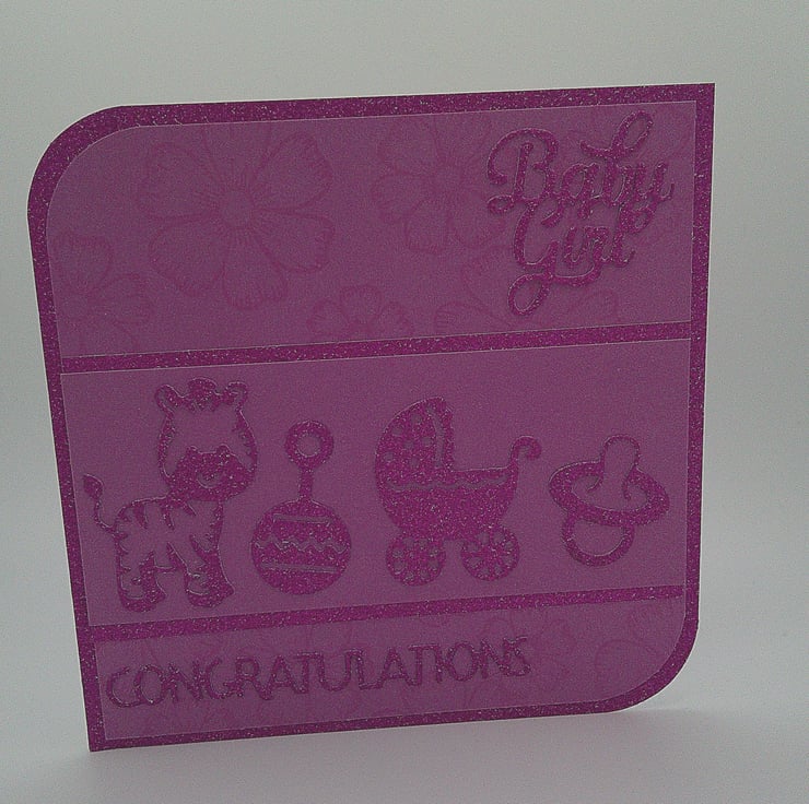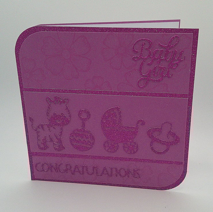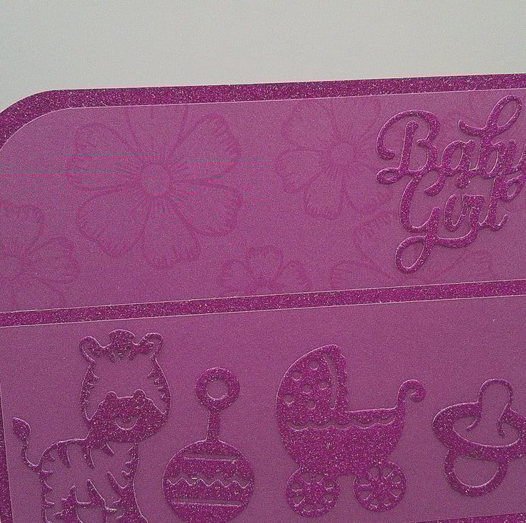Handmade card created using non-shed glitter card, die cut elements and tone on tone stamping in complimentary shades of deep pink. The sentiments on the front of the card read 'Baby Girl' and 'Congratulations' (both cut from the non-shed glitter card), and the internal stamped sentiment reads 'Welcome Little One'.