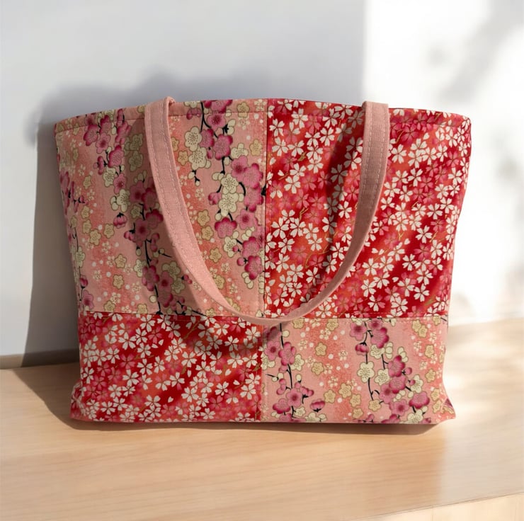 This tote bag is Delicate pink flowers with interwoven gold thread on a light pink base