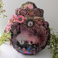 This Dragon eye has been hand painted in purples and golds the outer eye is In copper, green and gold with a hint of purple. Beaded with lilac beads which are unusual with veins running through with smaller deep purple and an assortment of matching feathers.