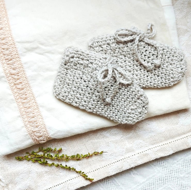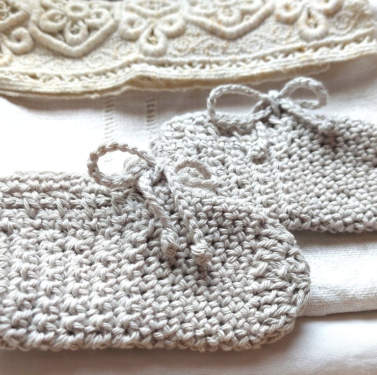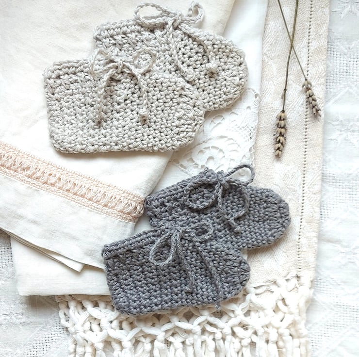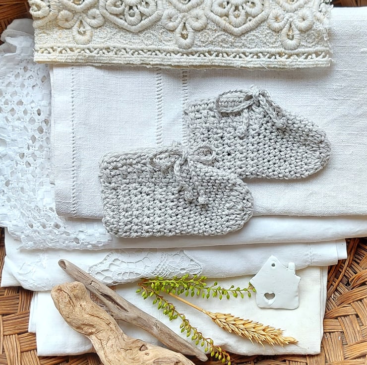 All little feet are different in size and length. Shoes need to be comfortable and not restrict your baby's feet. Please note that the measurements are only a guide, due to the different tension of the yarns and the individual crocheting of each unique handmade creation. The cotton stretches by 1cm approx. Can fit from newborn up to 4-6 months, depending on individuals.