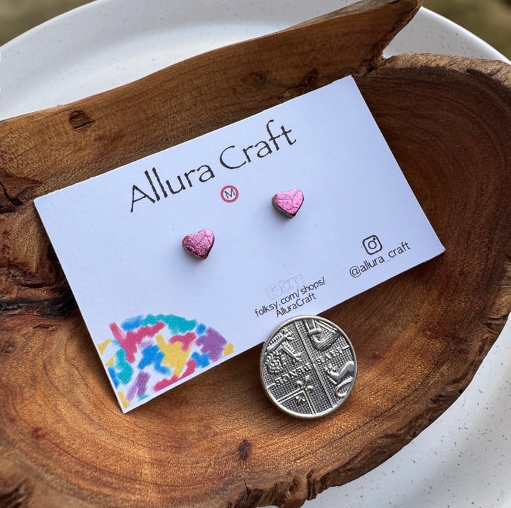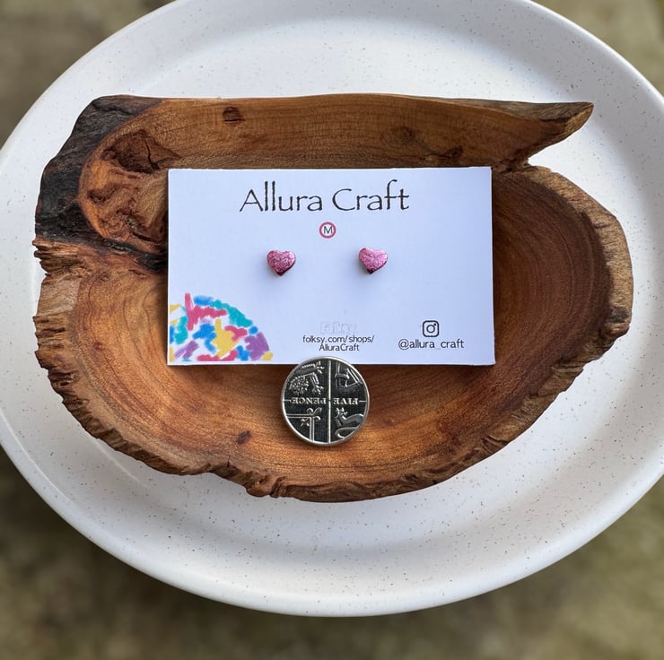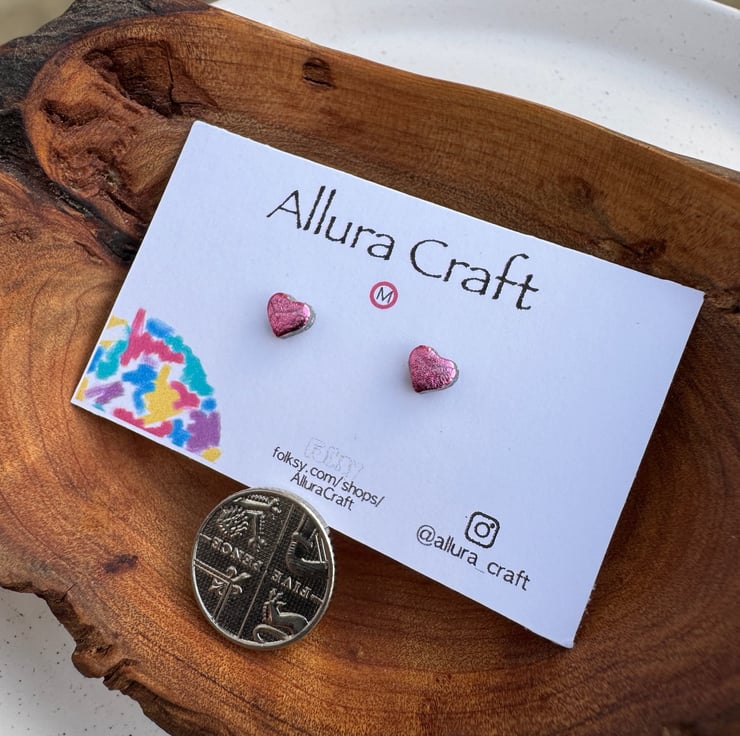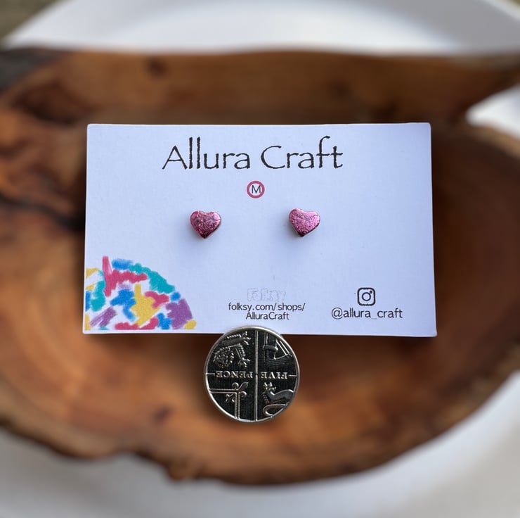Dainty micro Rose Pink leaf foil heart studs with a glossy uv resin finish