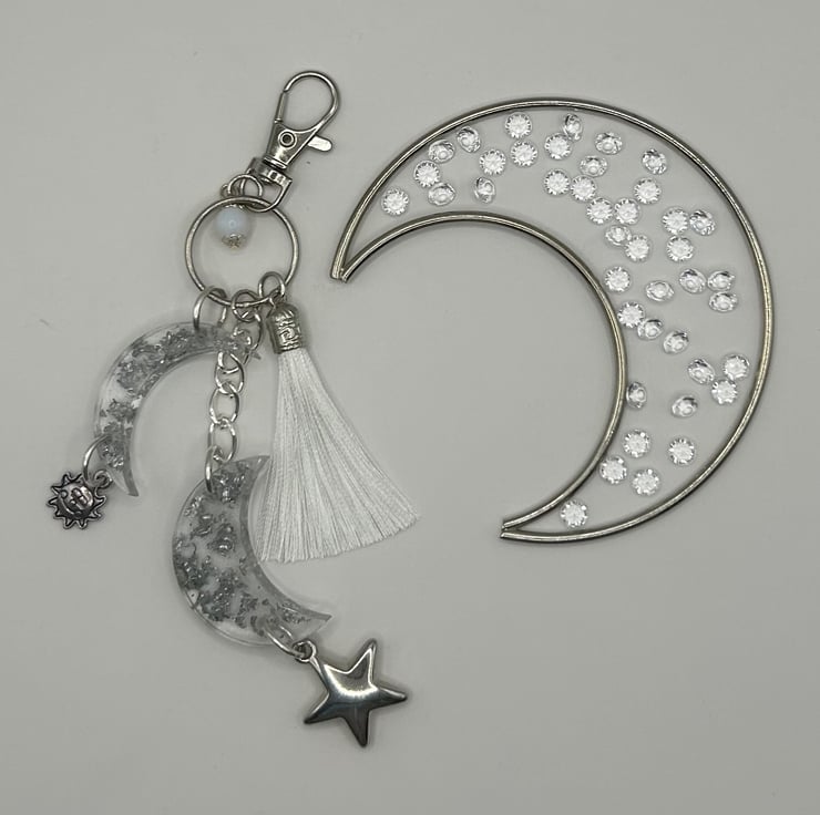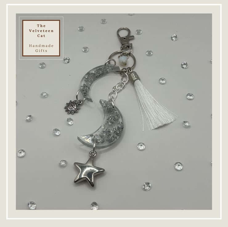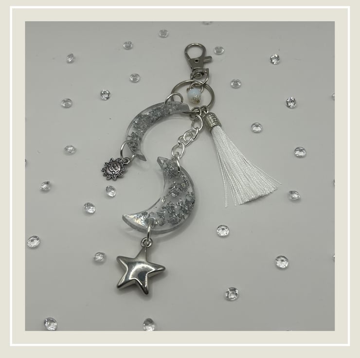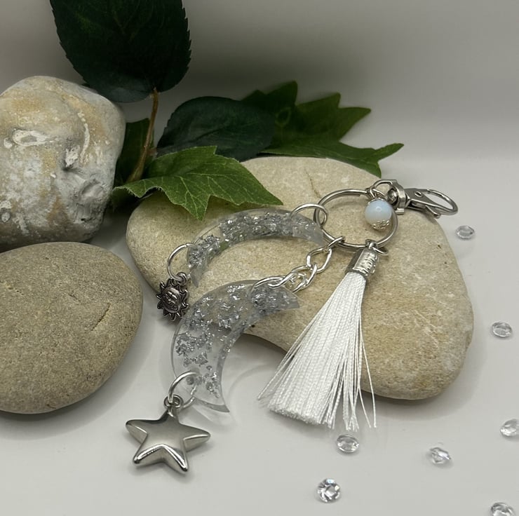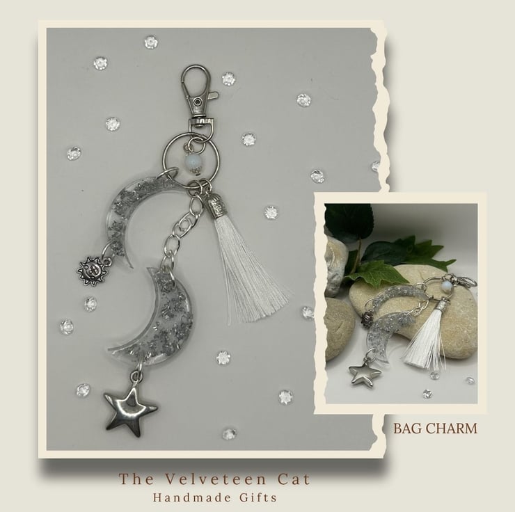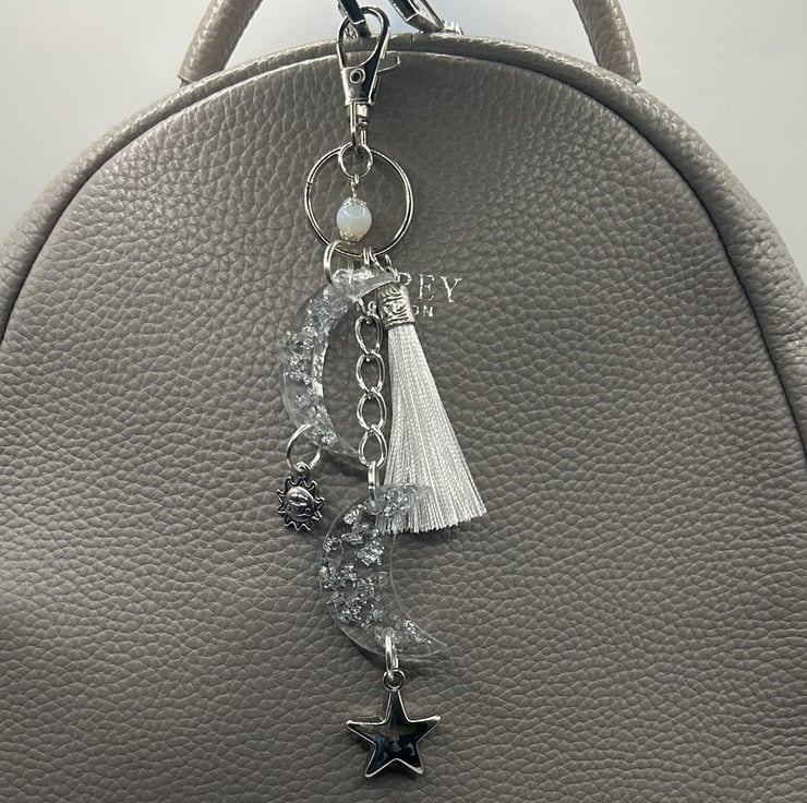 Not one but two shimmering handmade resin crescent moons adorn this positively charming bag charm. Each moon is made of eco friendly resin with silver leaf and crushed glass. From one moon daintily dangles a silver toned star and on the other, a small smiling sun charm. And that's not all, this fabulous bag charm also has a gorgeous moonstone hanging from the top and the whole heavenly ensemble is finished off with a long white tassel. This celestial unique creation of a bag charm could be yours or give it as a gift.