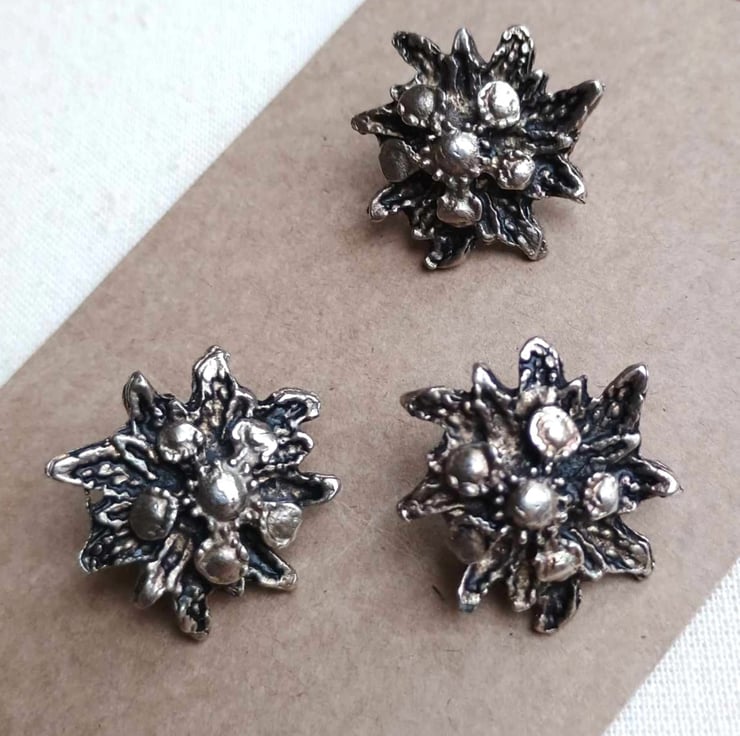 Vintage Button Set - three Edelweiss flower metal buttons with deep shanks