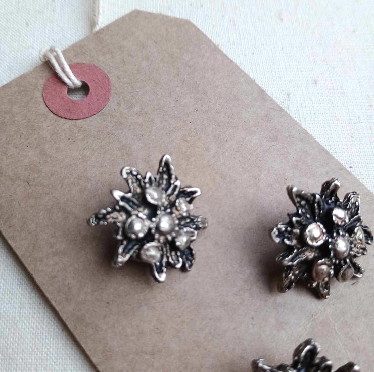 The Sound of Music - three vintage metal buttons in a highly detailed flower design. I think this is the alpine edelweiss - a symbol of Switzerland and immortalised in the musical - with little florets sitting in the centre of a rosette of pointed petal-like bracts.
