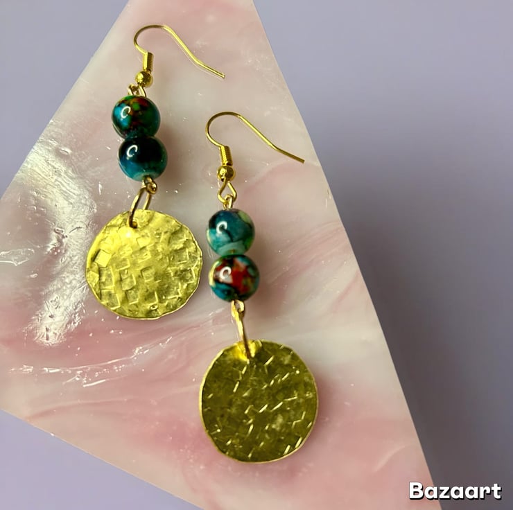 Earrings- Vibrant Beads Featuring a Textured Brass Disc - Boho style, Freepost