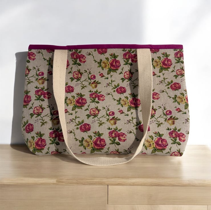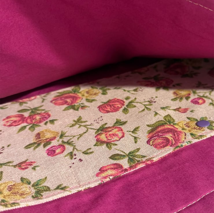 This delightful little tote bag is covered in small roses of pink and gold and purple on both sides