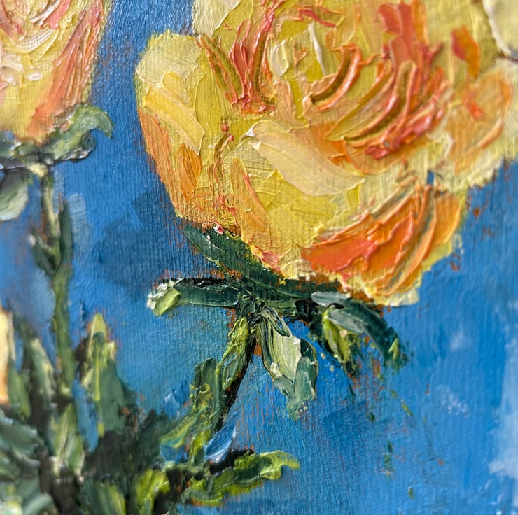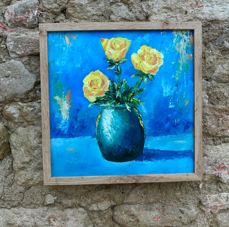 An original oil painting of yellow roses. A lively and expressively painted image. Perfect for any room in the house. 30x30 cm