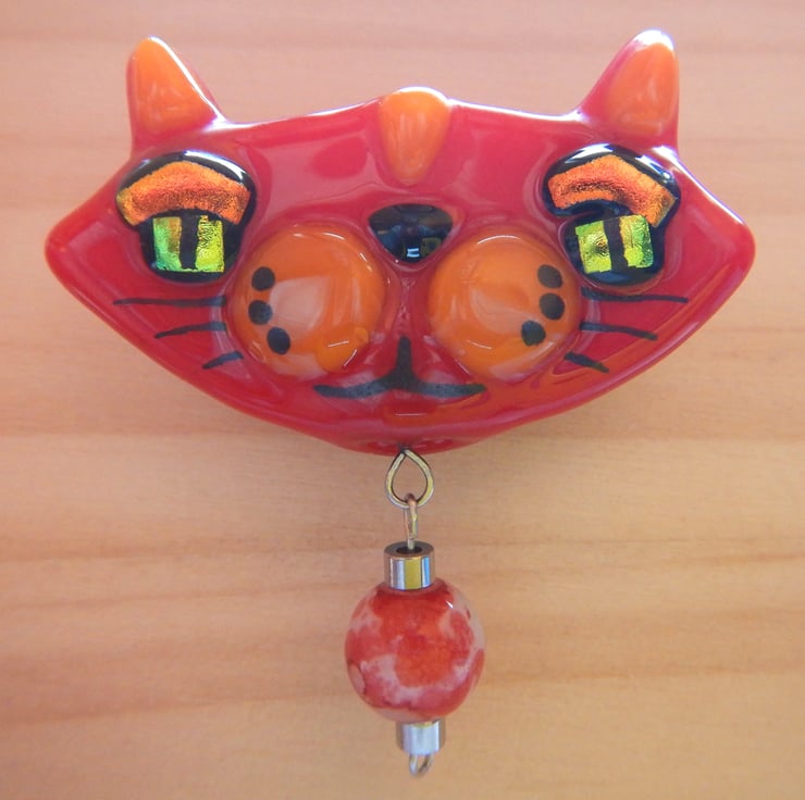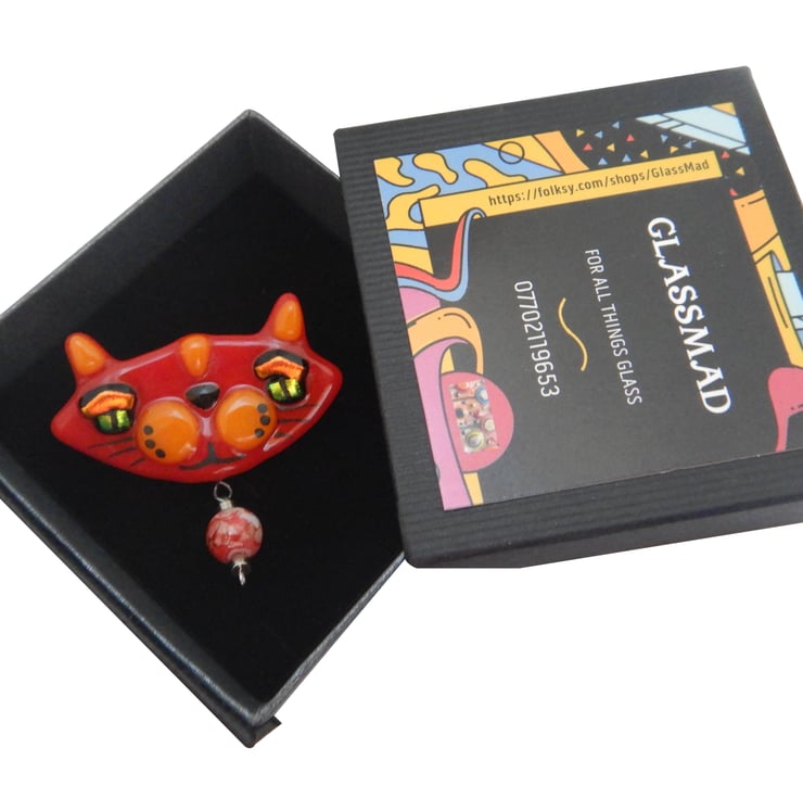 This Handmade Fused Glass Cat Brooch is created by GlassMad in Scotland. It features a unique design and is hand-crafted with fused glass. Perfect for cat lovers looking for a stylish accessory.
