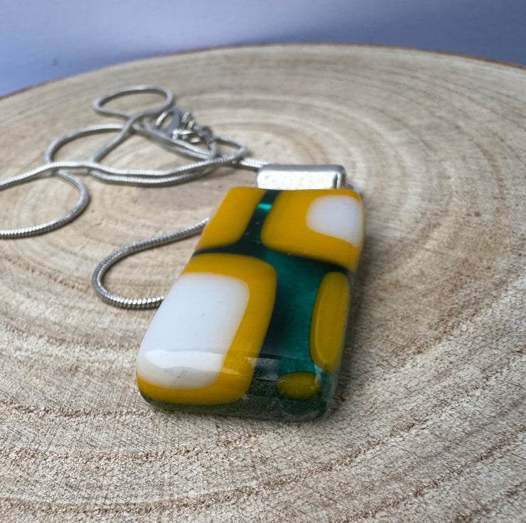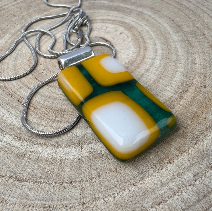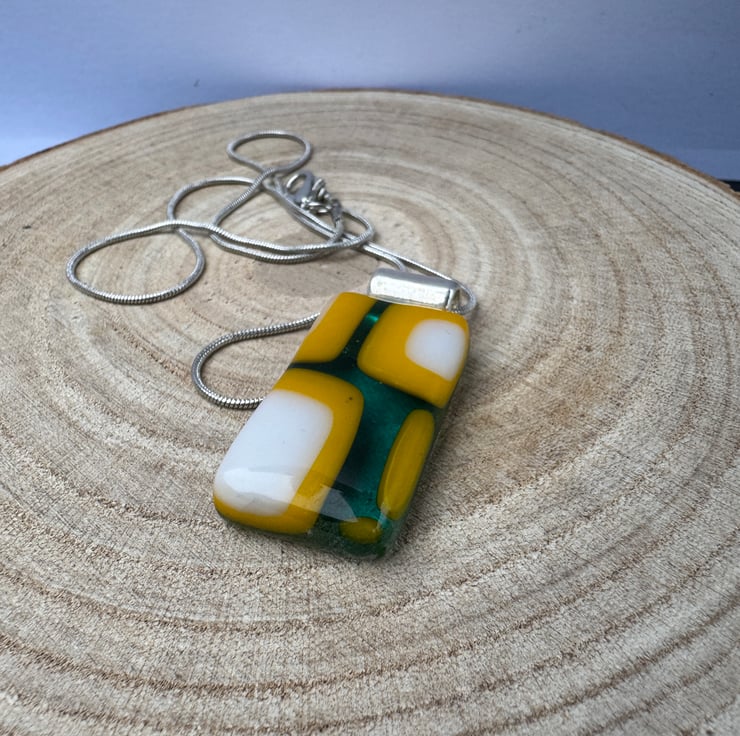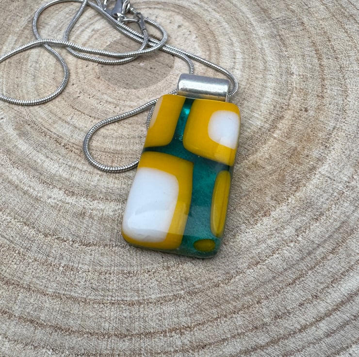 This stunning handmade blue, yellow, and white fused glass pendant is a true work of art, crafted with passion and precision. The vibrant blue, sunny yellow, and crisp white hues come together in a captivating design that evokes feelings of warmth, joy, and creativity. Each pendant is unique, with the fused glass technique allowing the colors to blend and swirl in beautiful, organic patterns. Perfect for adding a pop of color to any outfit, this pendant exudes a lively yet elegant charm. Whether dressing up for a special occasion or adding a playful touch to your everyday style, this one-of-a-kind piece will make a bold statement and become a cherished part of your jewelry collection.