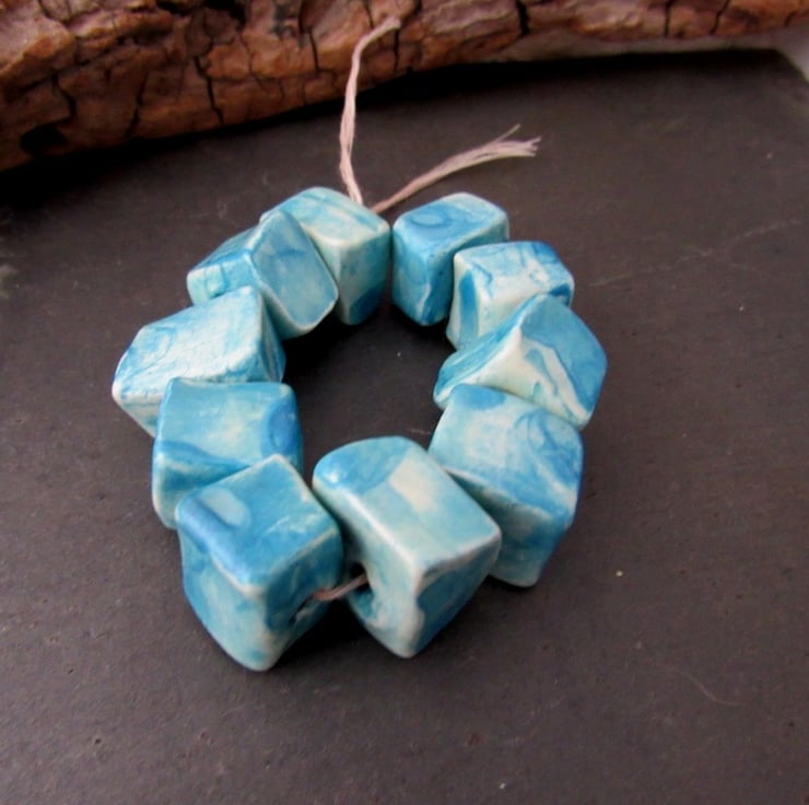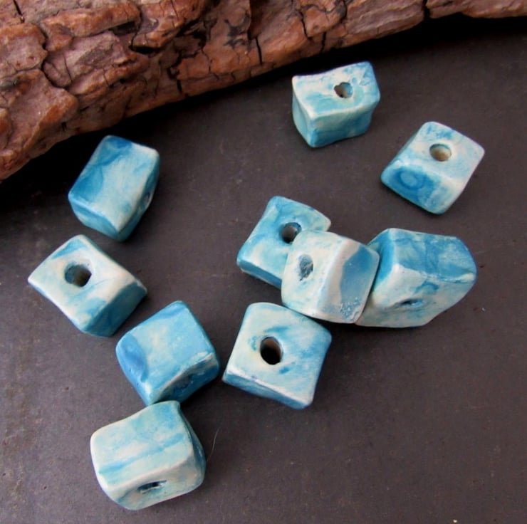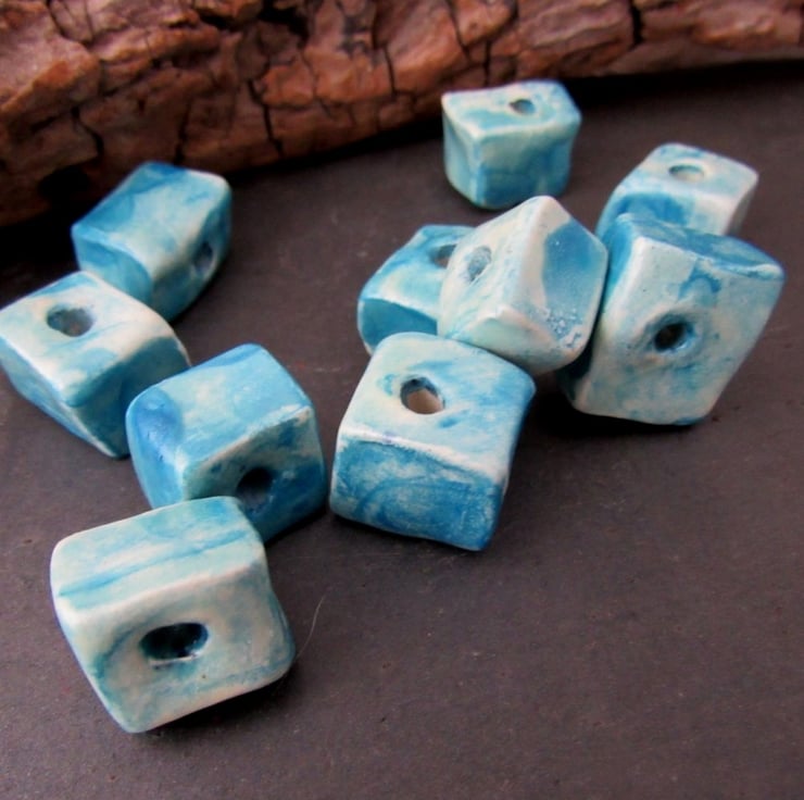 They are approx 1.3 cms (0.5") square and 0.5 cm (0.25") deep but as they are handmade, they are not identical and not perfectly cubic. Holes are approx 2-3mm.