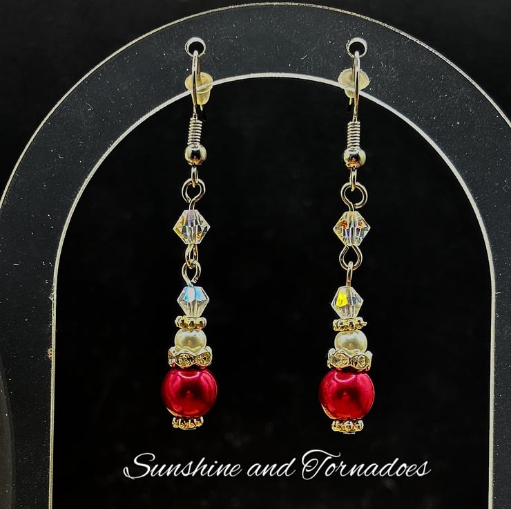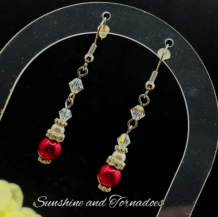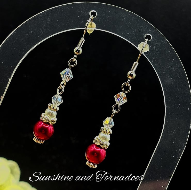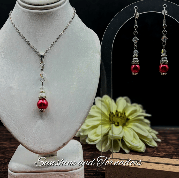 I have made this beautiful simplistic beaded jewellery set using red and white Faux Pearl beads and clear crystal bicones with silver plated spacers.