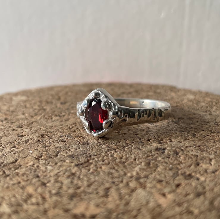 This ring was hand crafted in wax, using the build-up technique. Melting smooth grooves in to the band gives it an organic feel and dripping wax in to each corner of the stone creates the beads that hold the garnet in place.